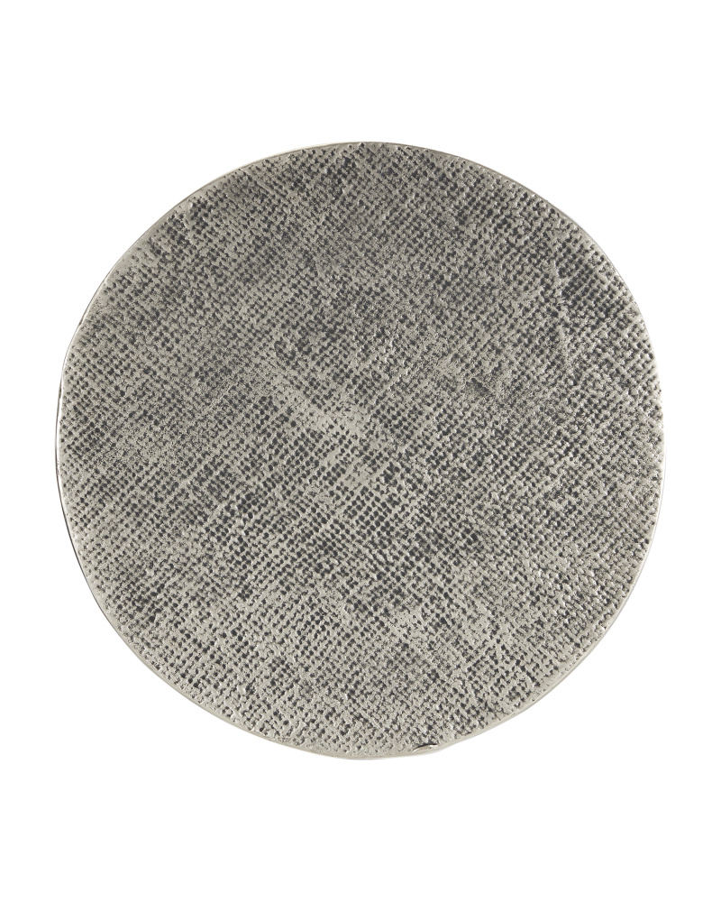 All the hallmarks of artisanship infuse the Kabeen Silver Accent Table with decorative creativity. Made of cast aluminum in an antique silver finish, the cylindrical table gleans its texture when a burlap sack is placed inside the mold. There are three mold lines, tell-tale signs of foundry craftsmanship, which are polished, as is the plinth base.