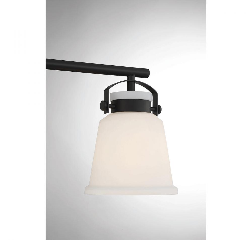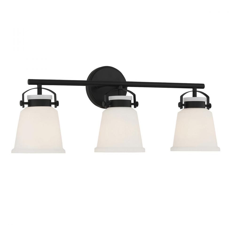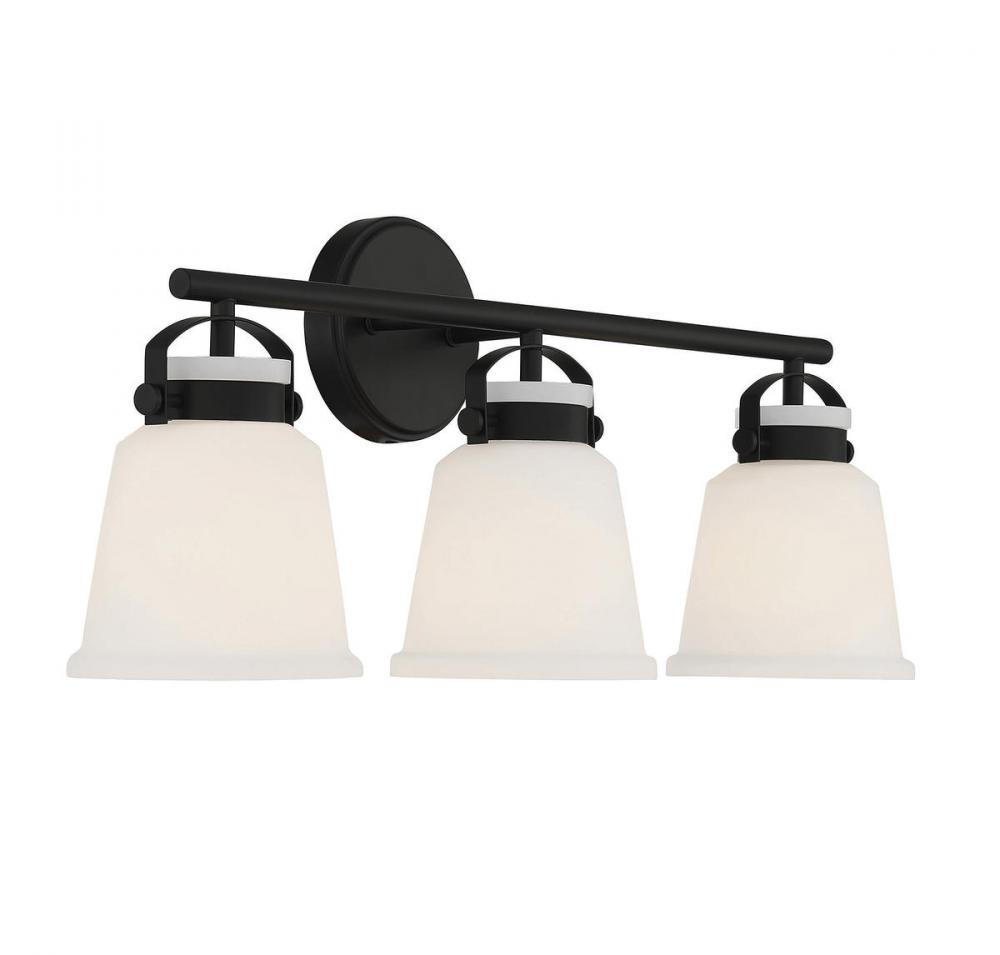 The Kaden 3-light bathroom vanity light from Savoy House has a classic look with a hint of industrial inspiration. White opal glass shades are held in place with eye-catching hardware that, like the bar and backplate, is finished in matte black. Kaden is 10.5" in height, 26" in width and extends 7" from the wall. It uses three standard size bulbs with a max of 60 watts per bulb. Damp area rated.