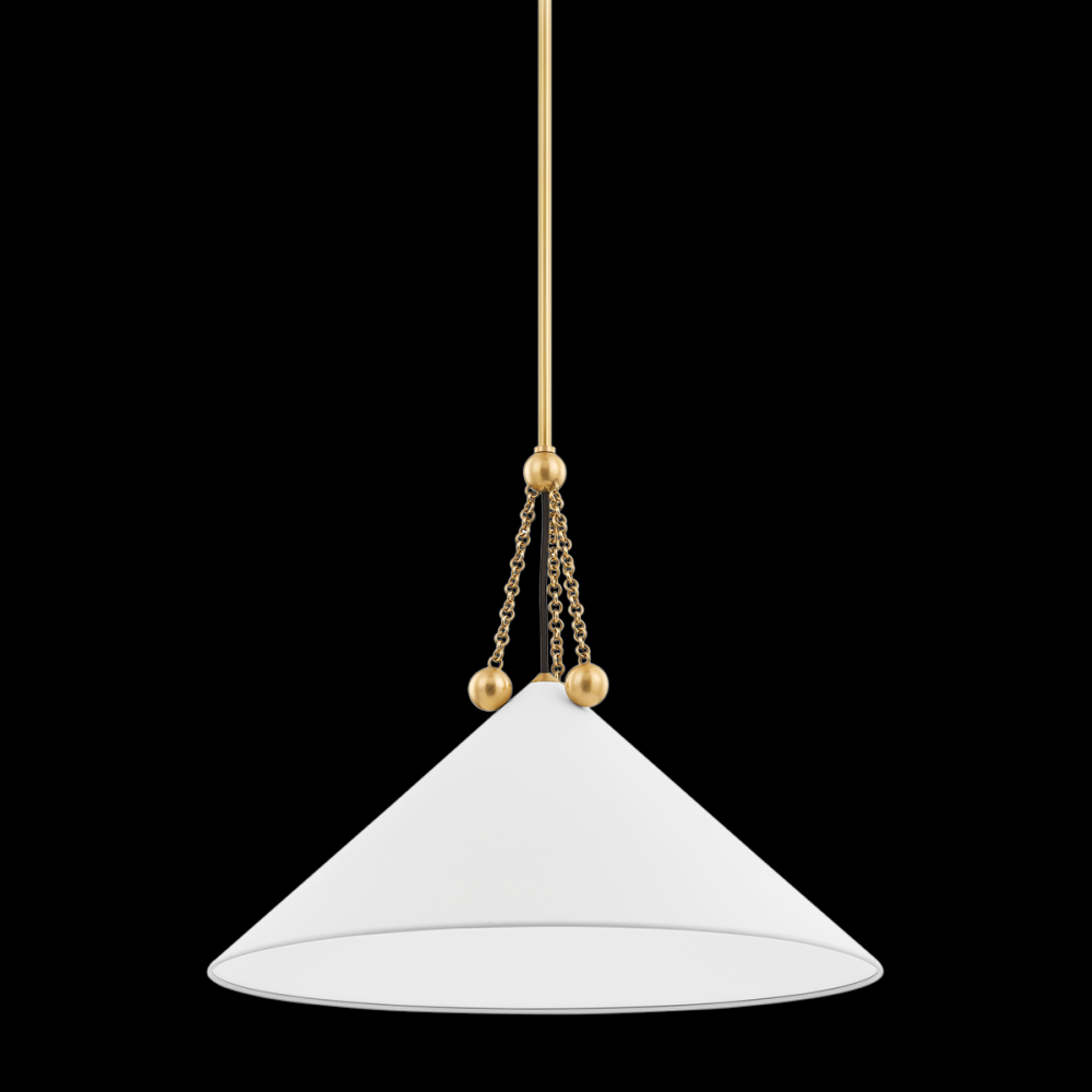 Boho meets Bauhaus in this ornamental and architectural pendant. The detailed Aged Brass chainwork, orb accents, and metal tip at the top decorate the straightforward, angular shade with jewelry-like accents. The all-over Soft White finish feels crisp and clean, while the Soft Black shade has a Soft White interior for a more dramatic effect.