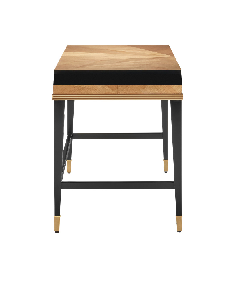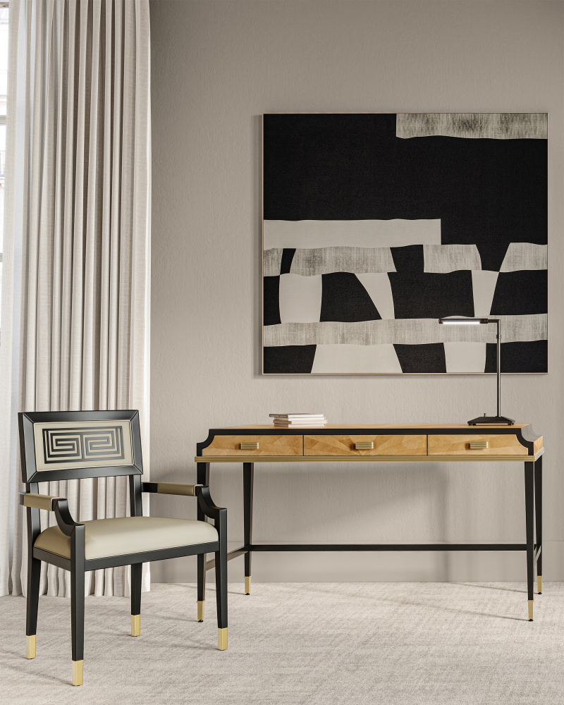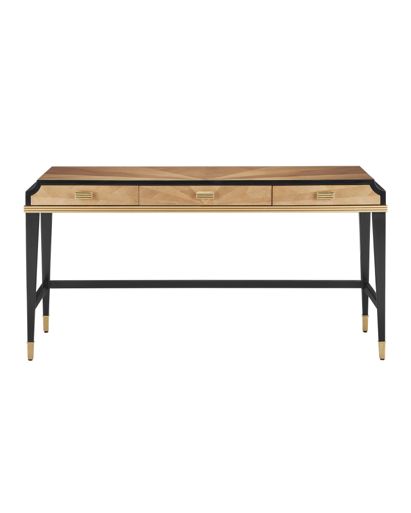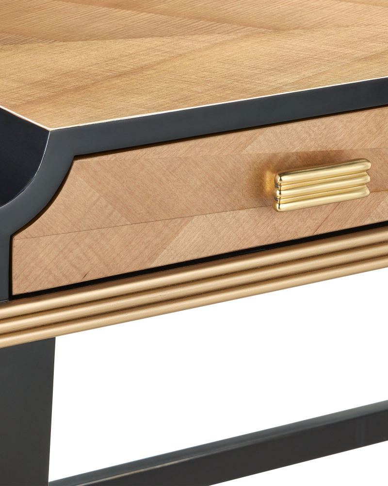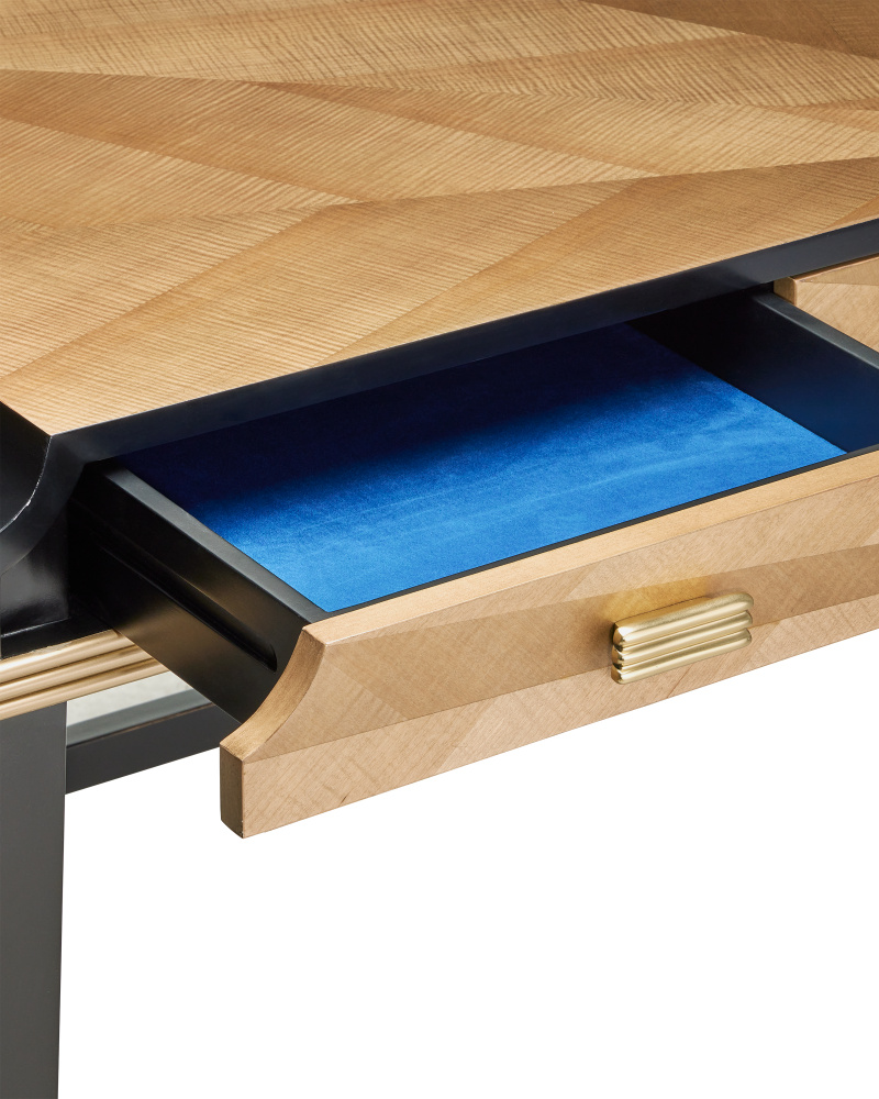 The Kallista Large Taupe Desk is clad in sycamore veneers with a beautiful taupe finish that enlivens the wood grains on the top, sides, and drawers. The shape of each of the cast brass door pulls mimics the scale of the detail below the drawers. The legs and delineated details that run along the top edge of the front and sides of the desk are made of mahogany in a caviar black finish and the tailored ferrules are in a polished brass finish. Specialty treatments include wood drawer slides, a fully-finished back, and faux velvet drawer liners.