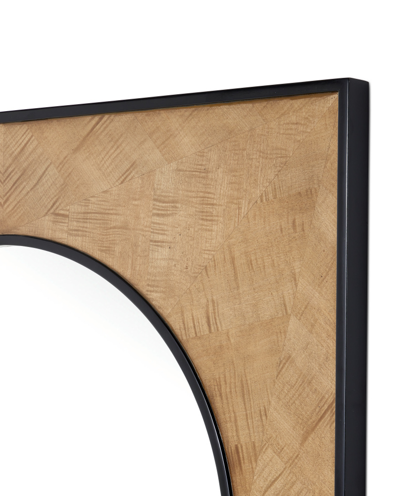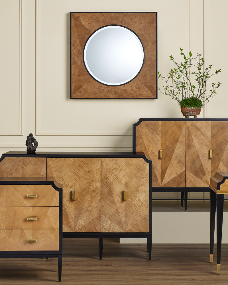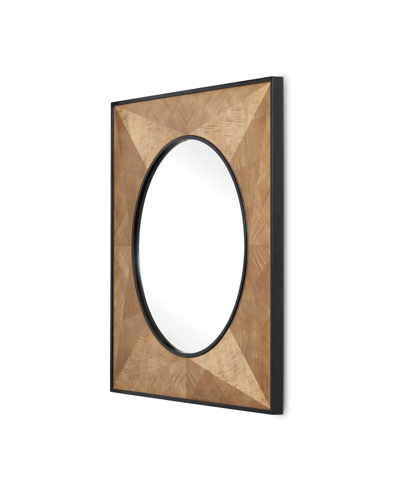 The Kallista Taupe Large Mirror has a sophisticated profile. Black mahogany trim surrounds the mirror and forms the outside edge of the frame into which sycamore veneers are set. The natural sheen of the veneer, placed in alternating directions, creates light and dark sections to increase the textural feel of the woodgrain on the mirror.