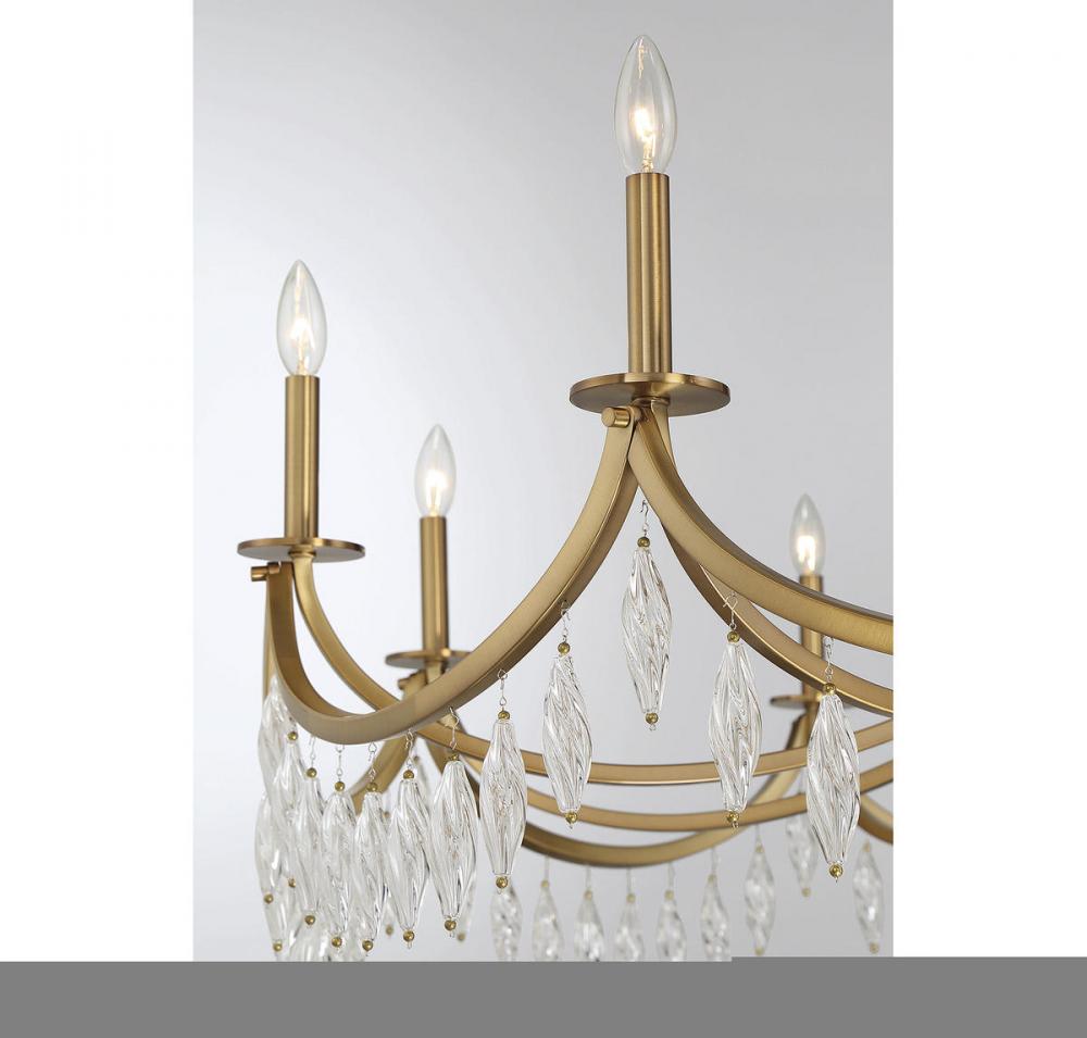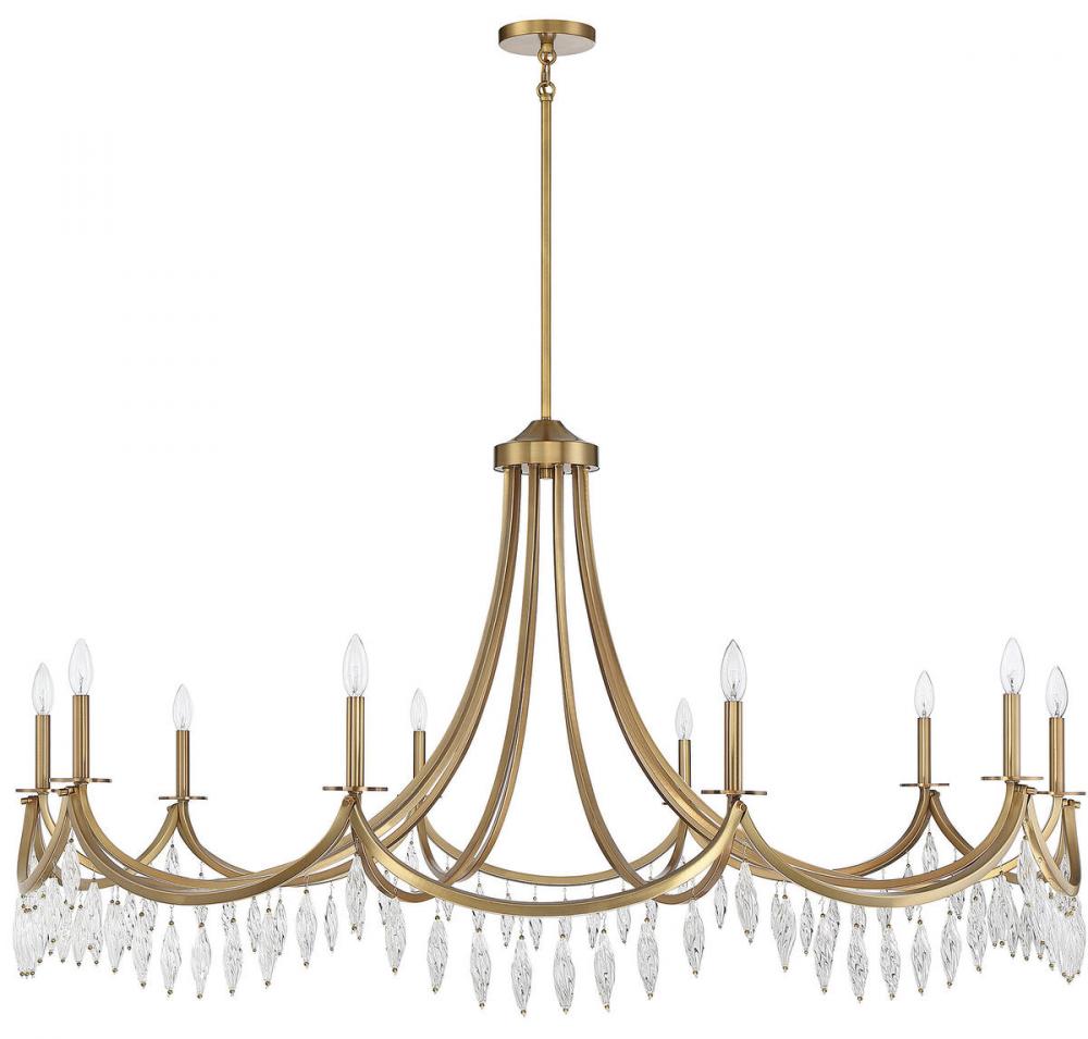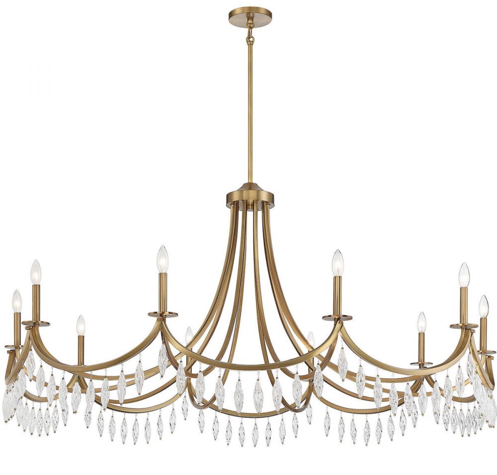Grand spaces need grand lighting - and this Savoy House Kameron 10-light chandelier is the perfect choice for grand illumination. Its magnificently curving arms, connected in a scalloping pattern, are decorated with spiraling crystals that are sure to catch the eye. Finished in warm brass. Kameron is 60" in width and it has an adjustable height ranging from 38" to 84". It uses ten candelabra size bulbs with a max of 60 watts per bulb. Comes with four 12" downrods and one 6" downrod, plus 80" of cord.