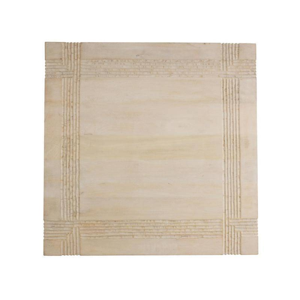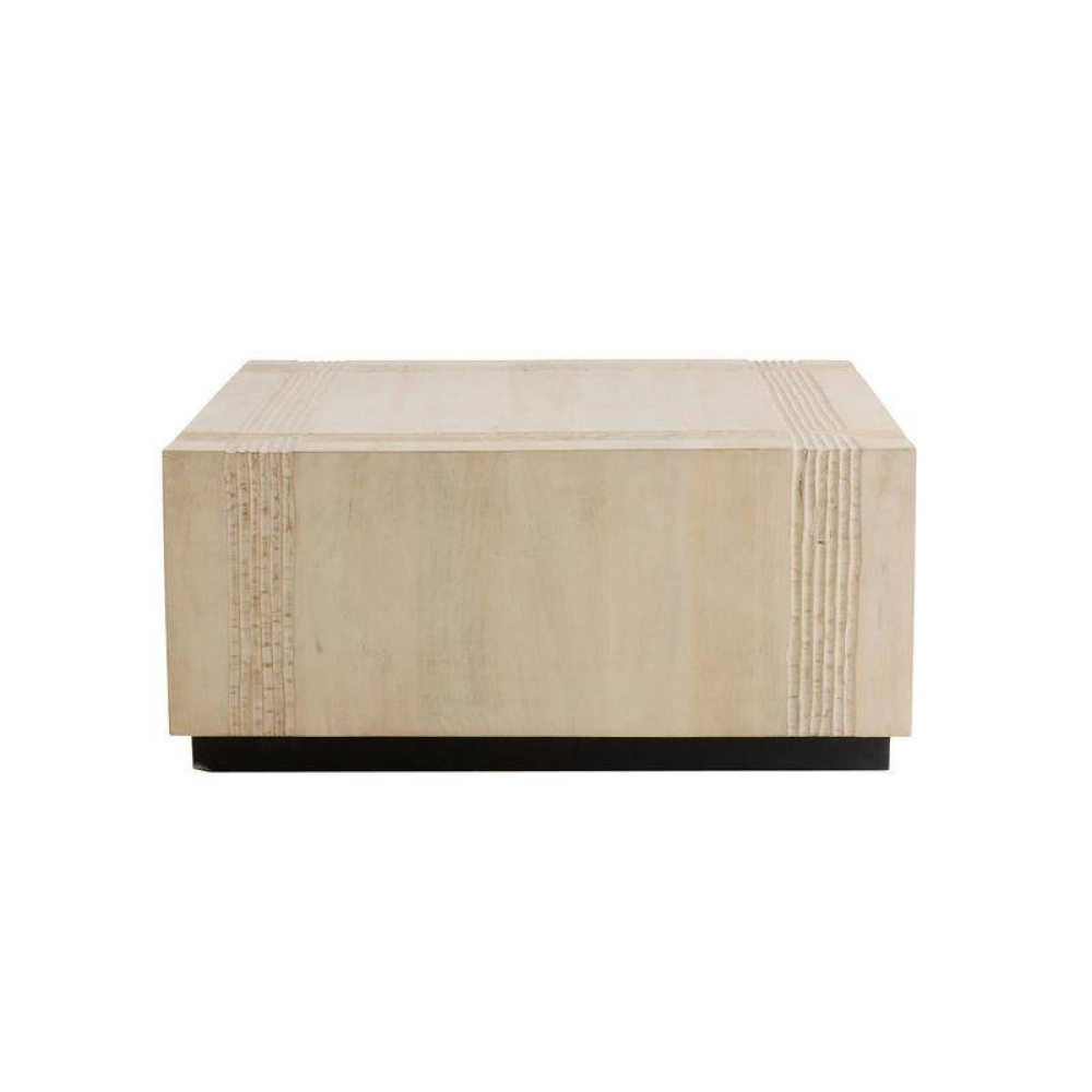 The woven effect of carved linework flowing over the top and sides showcases the handcrafted nature of the Kamira. Constructed of whitewash mango wood, it is secured to a contrasting blackened bronze iron base. Finish will vary.
