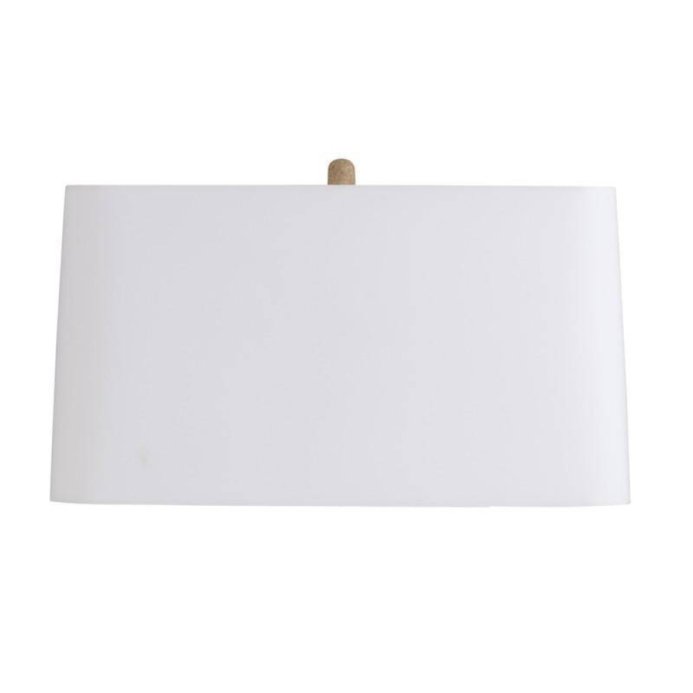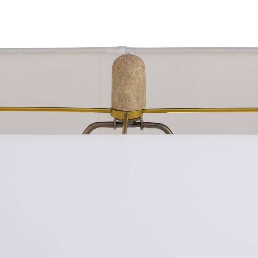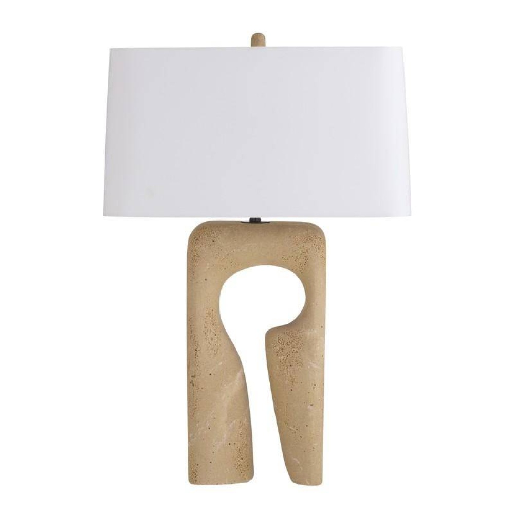 A sculptural form of sand faux travertine makes an artful base. This style's organic keyhole cutout plays with positive and negative space to lend an edge to any tabletop. Finished with bronze steel hardware, a rectangular ivory microfiber drum shade lined in off-white cotton and a matching faux travertine finial. Finish will vary.