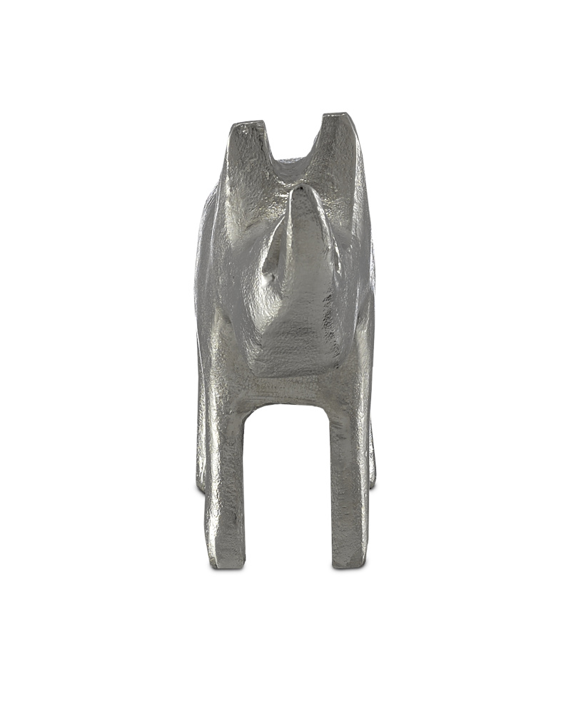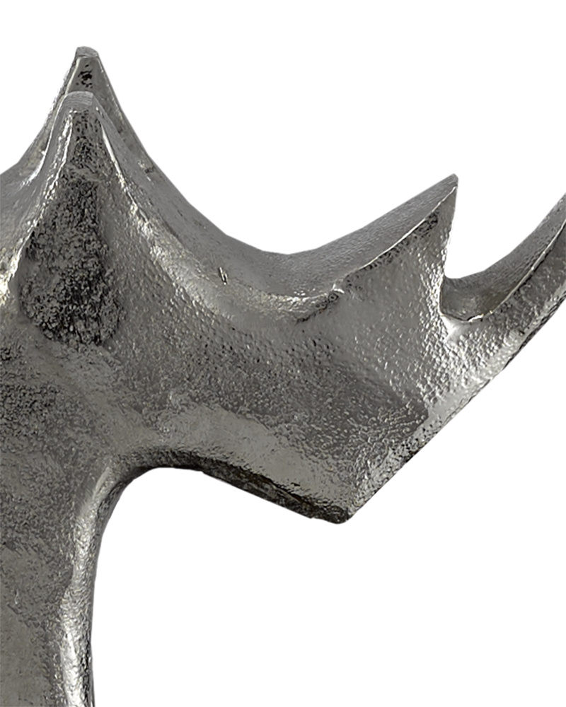The Kano Large Silver Rhino is made of cast aluminum in a silver finish. The stippled surface brings this silver sculpture with its implied features an extra dose of charm.