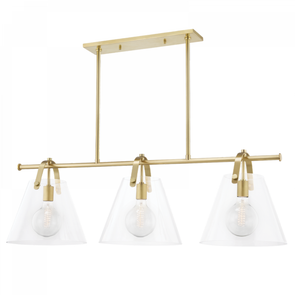 A metal strap arches over the open-top shade of this bell-shaped fixture that rings with style. An incandescent bulb shines through the clear glass shade—adding lots of light anywhere the linear, sconce or pendant is placed.
