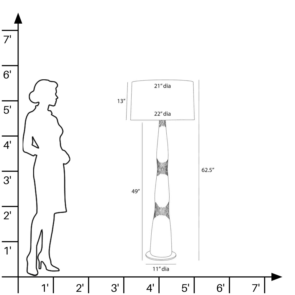 Carved details along the Kash's curvaceous base give this antiqued aluminum floor lamp an embodied energy. Reaching upward from the rounded base, this sculptural style was designed to provide maximum illumination throughout the room. It is accented with a classic white linen drum shade lined in white cotton, polished nickel hardware, and matching antiqued aluminum finial. Finish will vary.