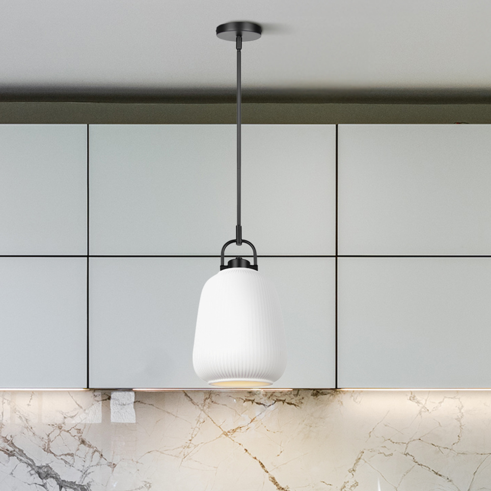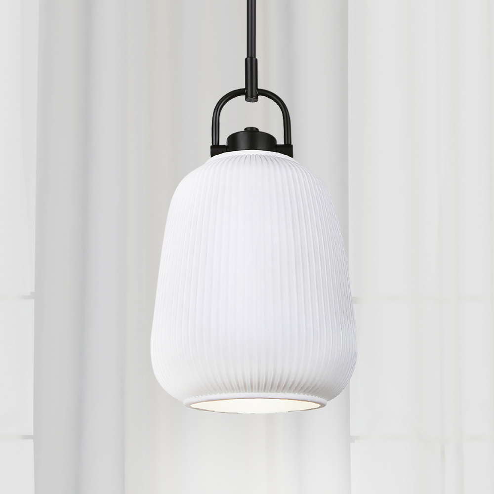 Contemporary Ceramic Pendant Light: A white ribbed ceramic shade paired with a matte black frame creates a pendant that blends modern sophistication with calming texture.