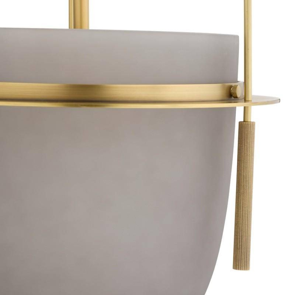 Neo-classically inspired, the Kathleen is a timeless bell jar fixture delivered in frosted smoke glass. Suspended from antique brass-plated steel with ridged details, the cup and pole design were inspired by counterweights. Finish will vary. Damp-rated, although limited, covered outdoor conditions may affect finish.