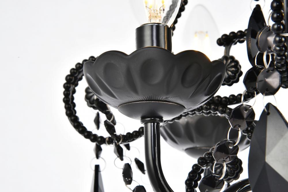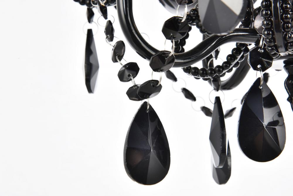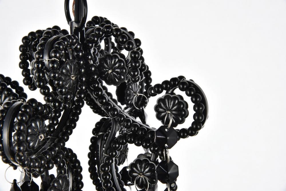 Experience the grandeur of classic rococo ornamentation in the compact fixtures of the Kato collection. These pendants feature fanciful curved, beaded arms festooned with beautiful strands of cockled Crystal flowers and accented with royal-cut Crystal almond droplets. Available in a polished-Black finish with Black Crystals or a Chrome finish with clear Crystals. Ample illumination is provided by four candelabra-style bulbs (Not included) atop coordinated bobèches.