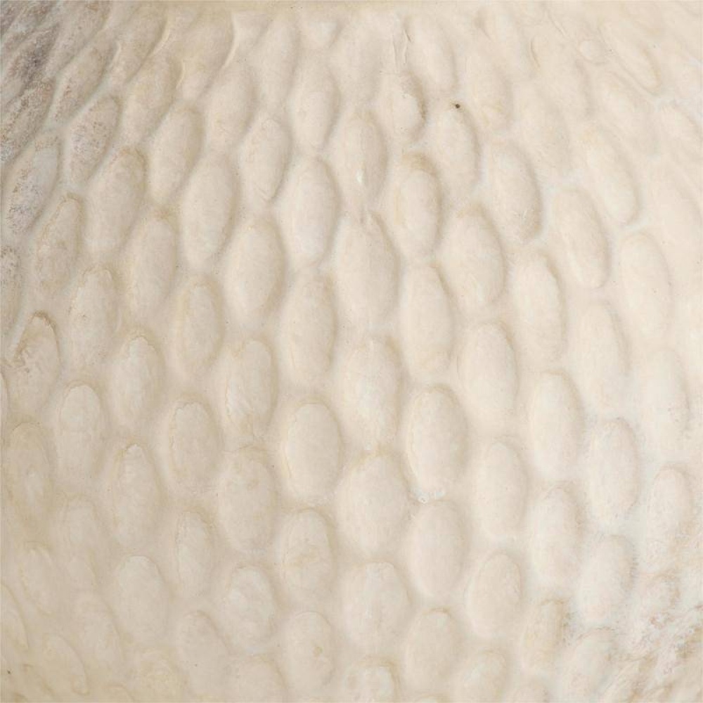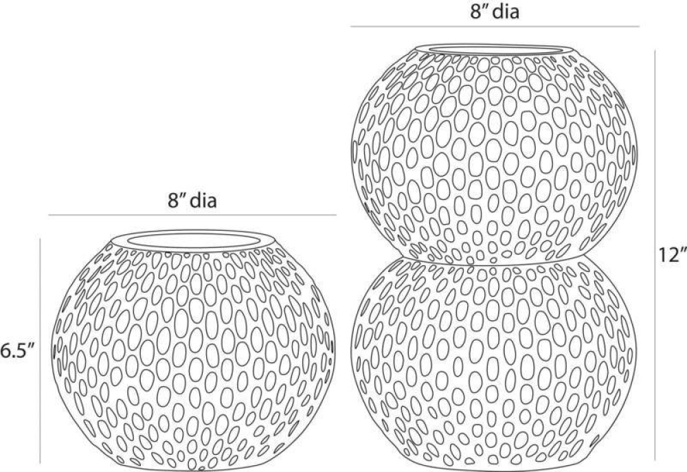 In this set of two terracotta vases, one single and one stacked for asymmetry. Each sphere vase is glazed in eggshell with a chiseled texture and felted at the bottom. Finish will vary.