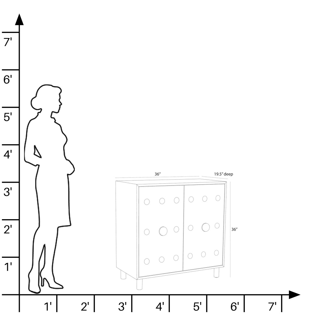 Punctuated by vintage brass inlays, this olive ash veneer cabinet is reminiscent of a fashionable tailored and buttoned vest. The truffle burl finish adds a hint of graphic glamour while playing up the dramatic contrast with the blending hardware. Double soft-close doors open to reveal two adjustable shelves. Encased in a matching truffle olive ash veneer frame. Finish will vary.