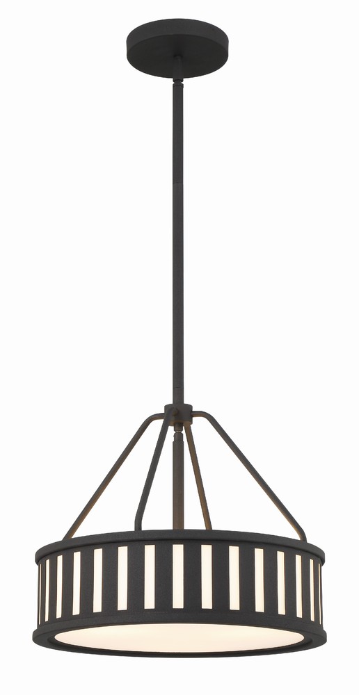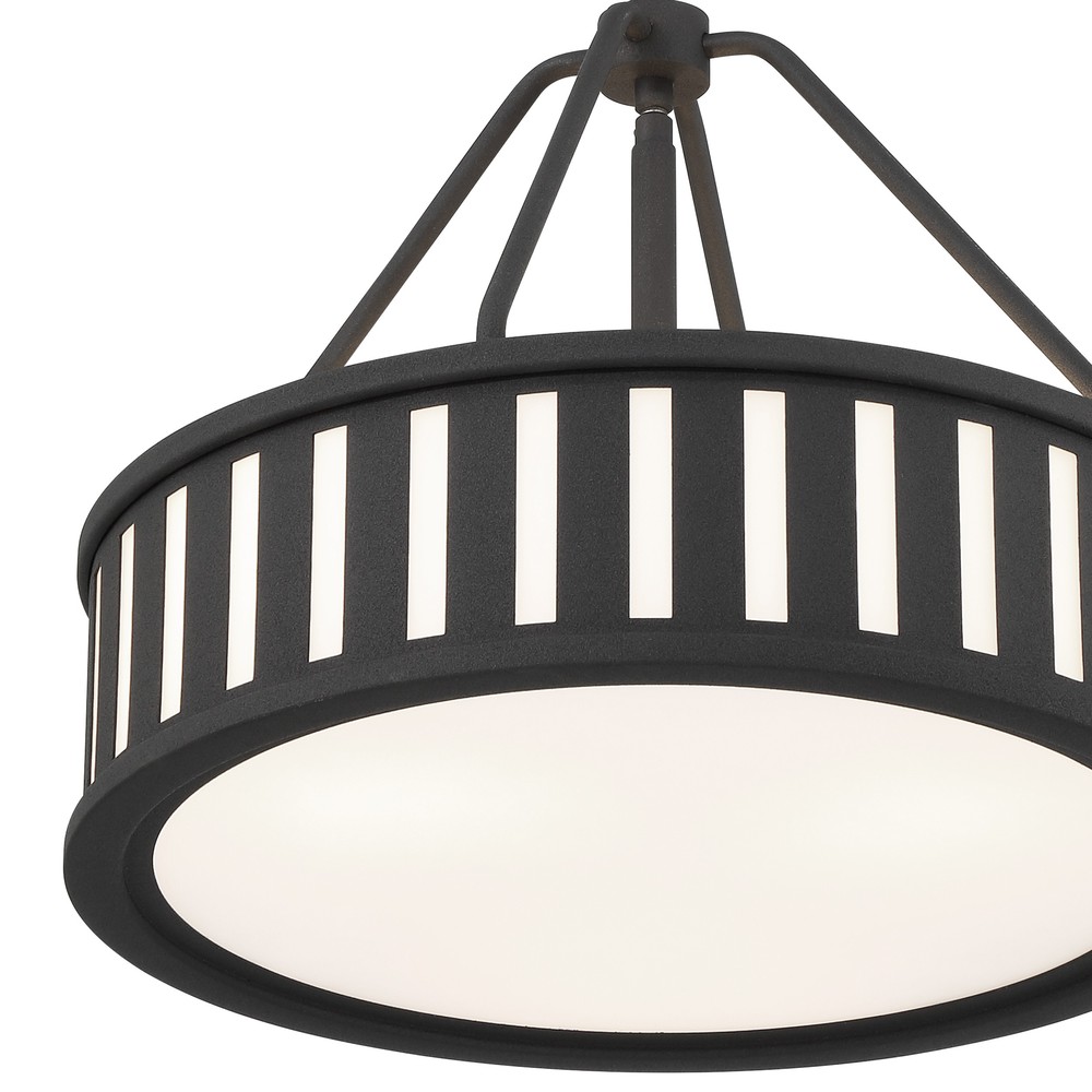 The contemporary Kendal collection makes a statement with its graphic uniform pattern. Its metal frame surrounds white glass in this elegant drum-shaped pendant. The high contrast of Vibrant Gold, Black Forged, or Polished Nickel against white glass is a great way to add a touch of drama to a room.