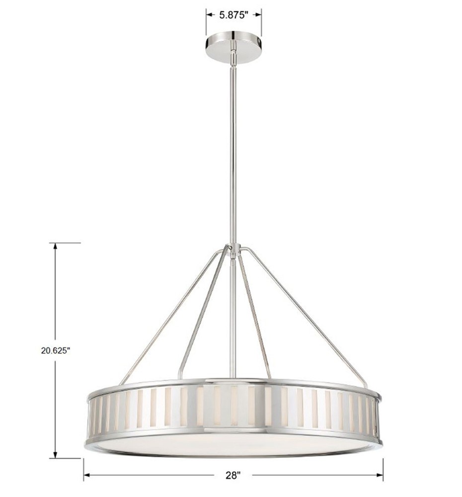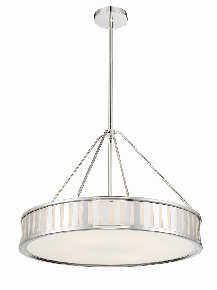 The contemporary Kendal collection makes a statement with its graphic uniform pattern. Its metal frame surrounds white glass in this elegant drum-shaped pendant. The high contrast of Vibrant Gold, Black Forged, or Polished Nickel against white glass is a great way to add a touch of drama to a room.