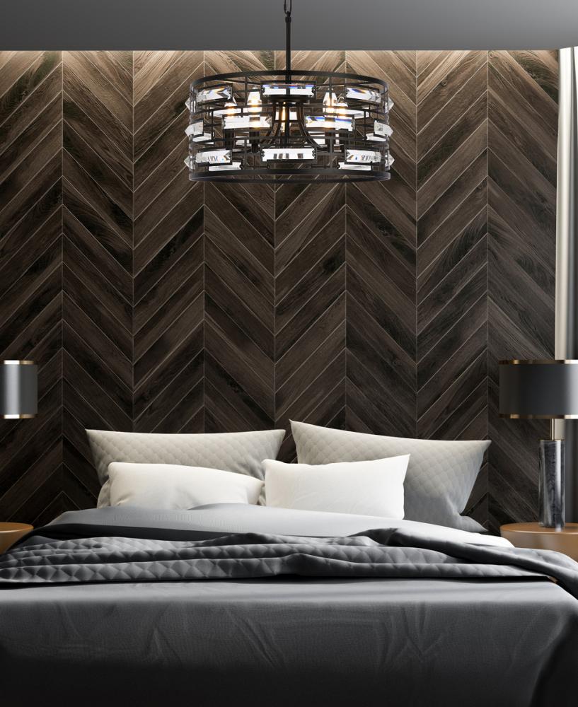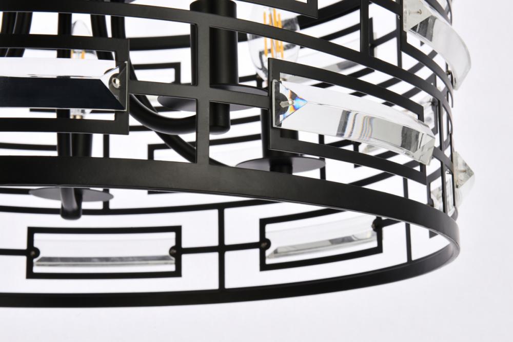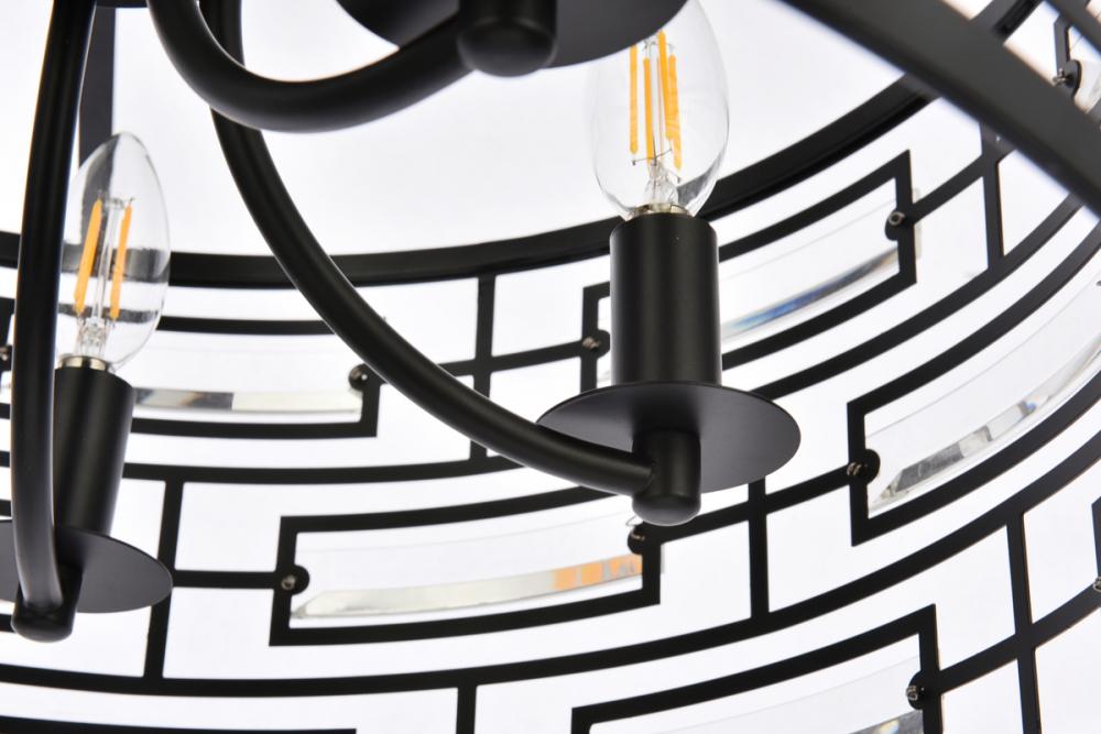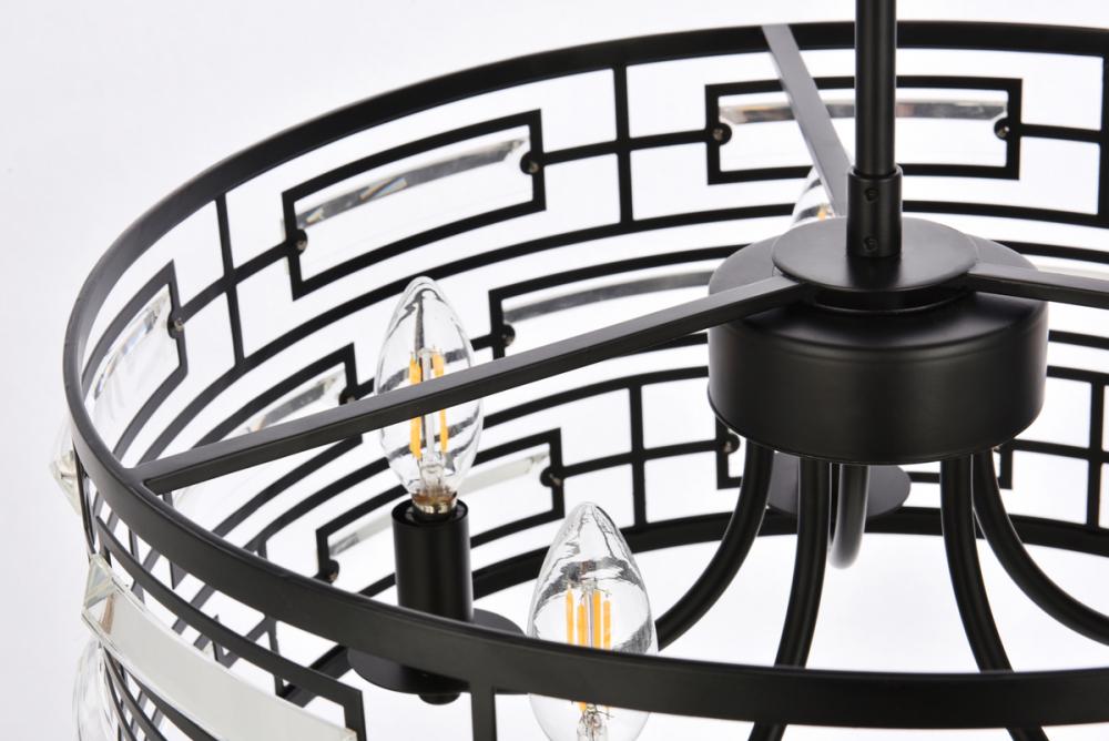 Clear rectangular crystals reflect the soft glow of candelabra bulbs