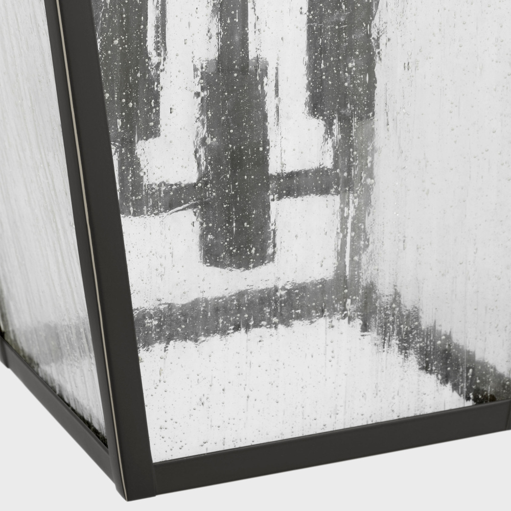 Crafted with Aluminum in a Antique Bronze finish with clear seeded glass shades