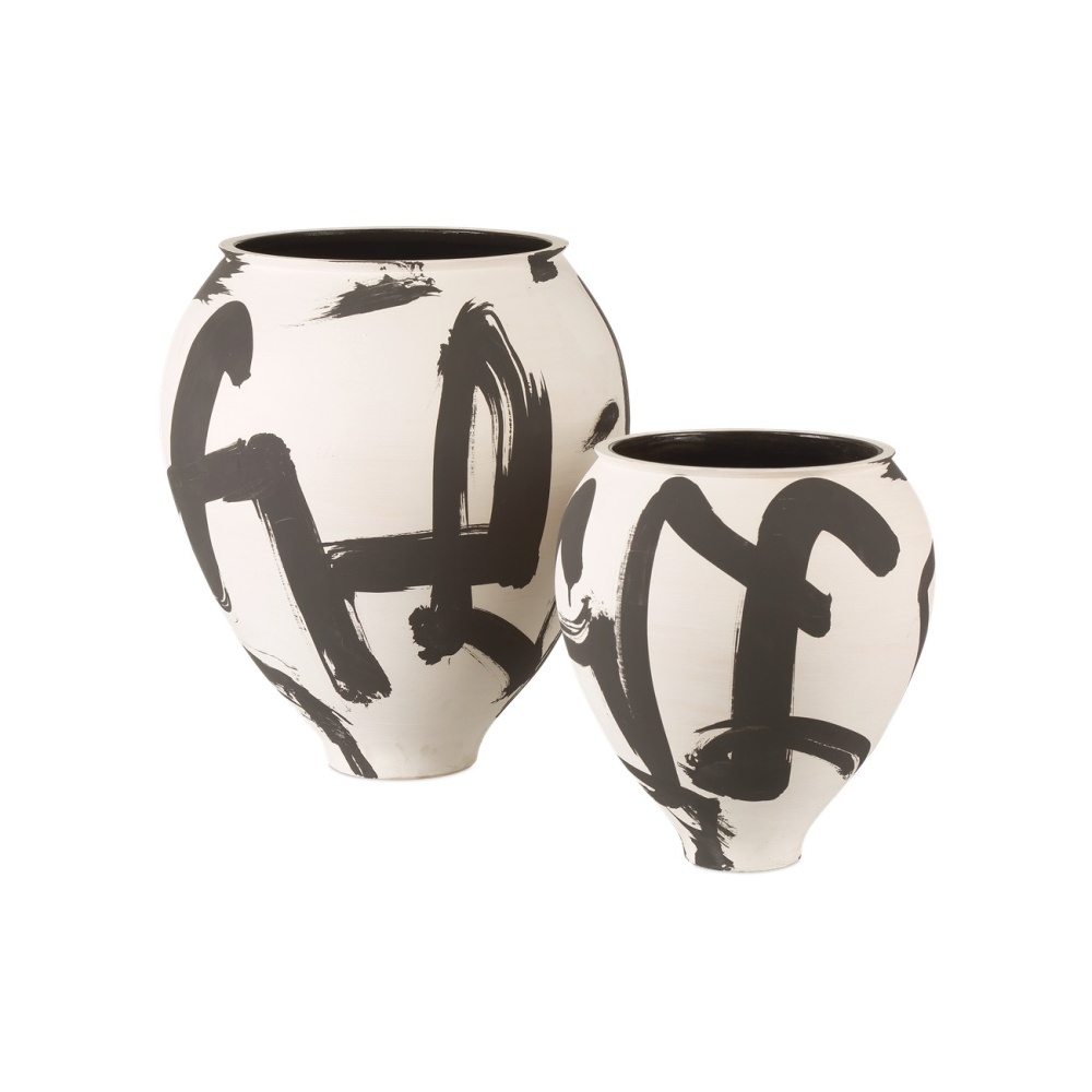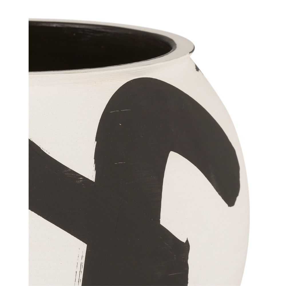 The sketched pattern on the surface of the Kenzo Medium Vase was inspired by the art of Imperial Japan, particularly the Enso, a prolific symbol in the Zen practice of painting. Made of porcelain, the black and off-white vessel is finished on the inside; and it is hand-thrown, hand-glazed, and hand-decorated so the patterns on each vase will vary slightly.
