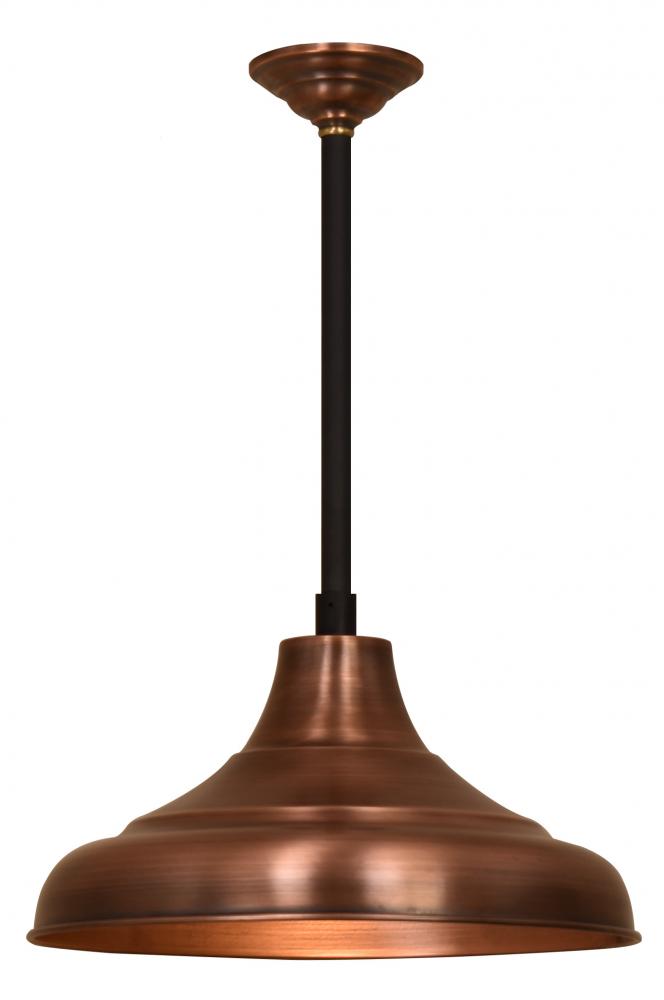 Residential or commercial lighting fixture designed to reflect light in a downward direction (Reflector Luminaire Manufacturer). Ships with 12 inch Down Rod if length not specified. Down rod up to 24 inches included. Specify desired down rod length from 6-24 inches. If longer Down Rods required, order Custom Down Rod with desired length. Diameter of shade is 17 inches. Includes Copper Canopy with ceiling mount.