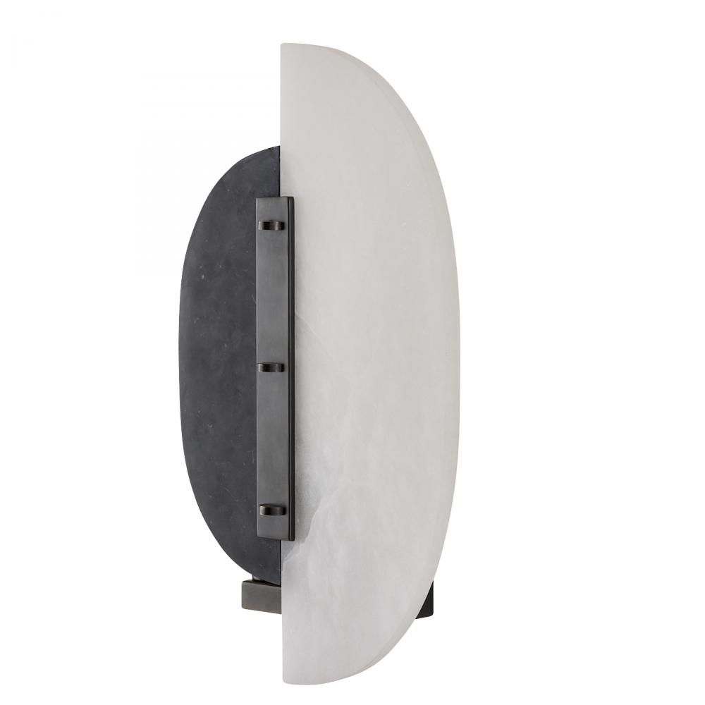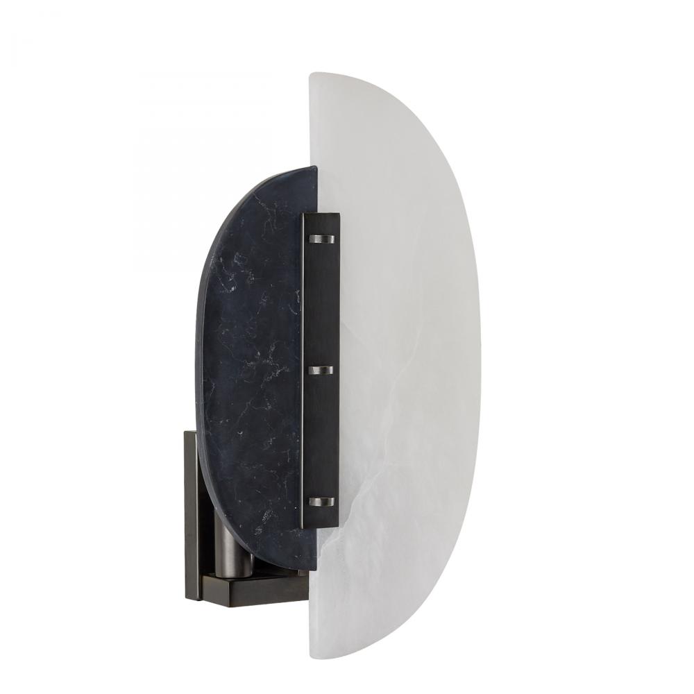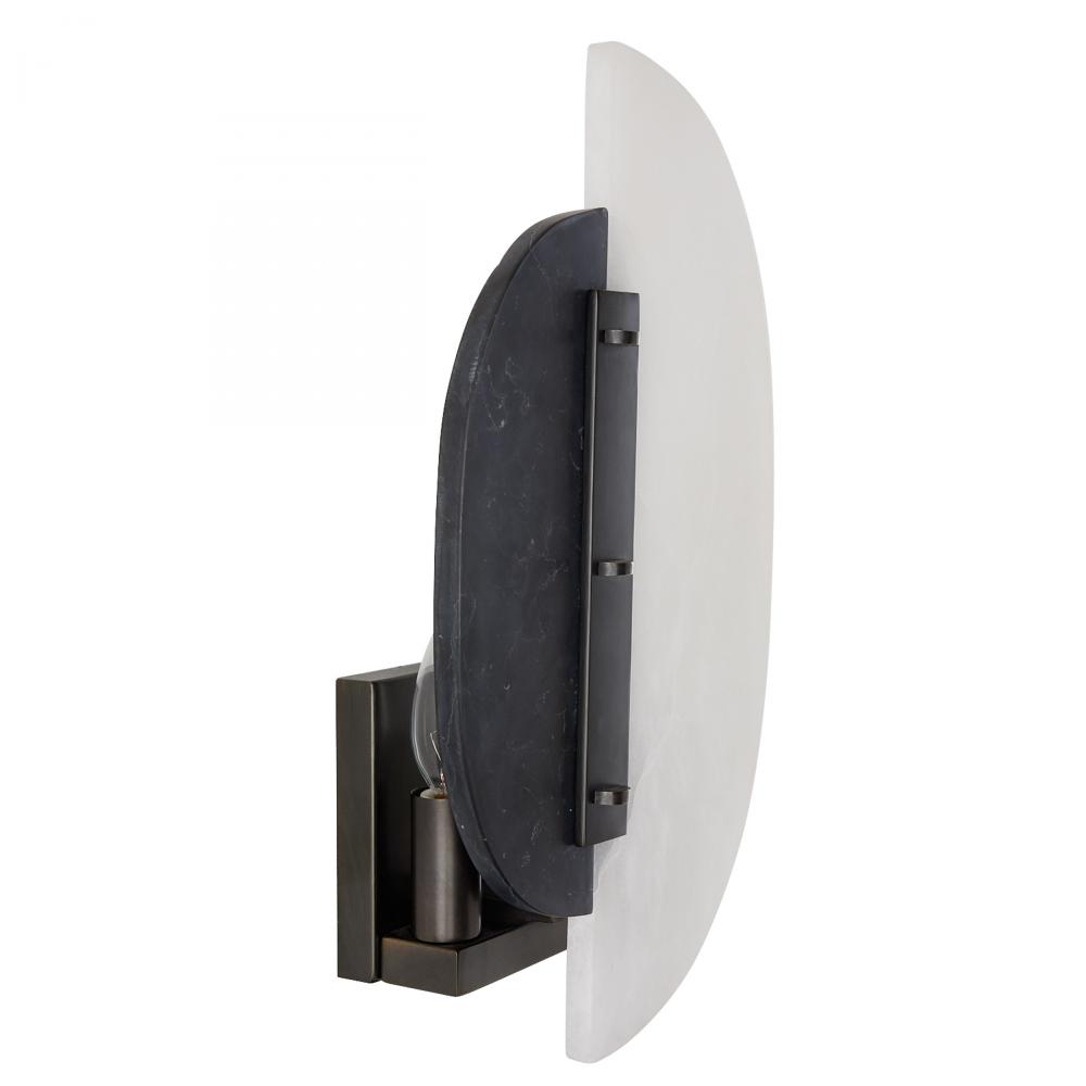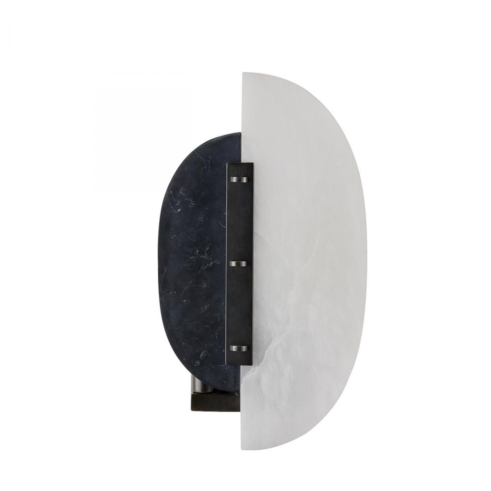 The curved door pulls of our Kianna credenza inspired the hardware on this sculptural sconce. Crafted in alabaster overlaid with an asymmetrical plate of black marble, it delivers both style and function through artistic, architectural elements. Accented in English bronze steel. Finish will vary.