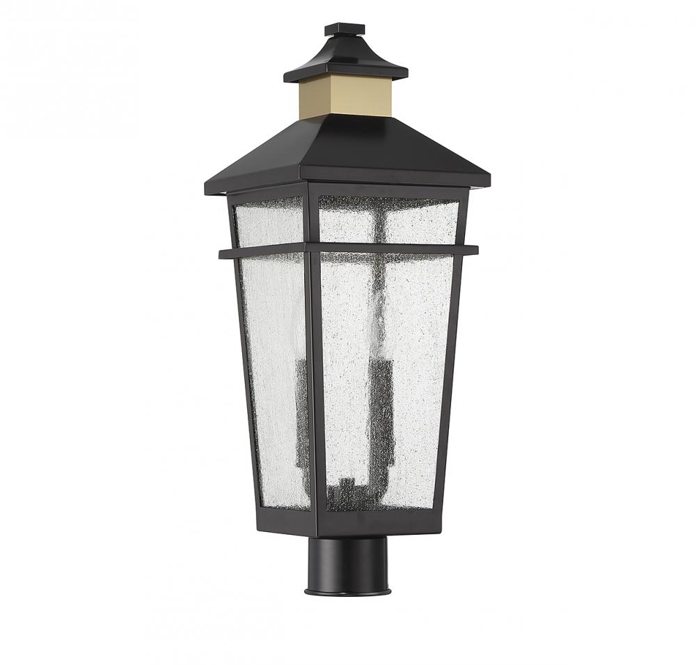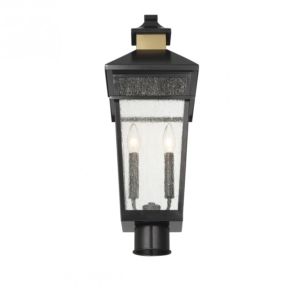 This Savoy House Kingsley 2-light outdoor post light has a coastal-inspired lantern style with highly fashionable touches. Panes of seedy glass are accentuated by a matte black finish with brass detailing at the hood. Kingsley is 22.5" in height and 8.5" in width. It uses 2 candelabra size bulbs of up to 60 watts per bulb (bulbs not included).