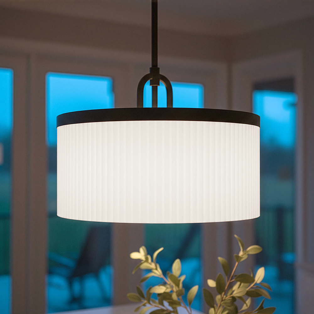 The KINSLEA pendant embraces calm refinement, where matte black finish meets tactile texture for lighting that feels quietly elevated. Flat opal ribbed glass transforms illumination into a soft, luminous presence, creating a sense of warmth and balance. Its dual-mount design offers flexible style, allowing it to be suspended as a pendant or anchored as a semi-flush mount, adapting to the needs of your space. At 14 inches wide, KINSLEA delivers an elegant statement without overwhelming, making it ideal for bedrooms, dining areas, entryways, or transitional zones. It favours subtle detailing over ornament, turning functional light into a graceful design element. The result is lighting that feels enduring, understated yet distinct.