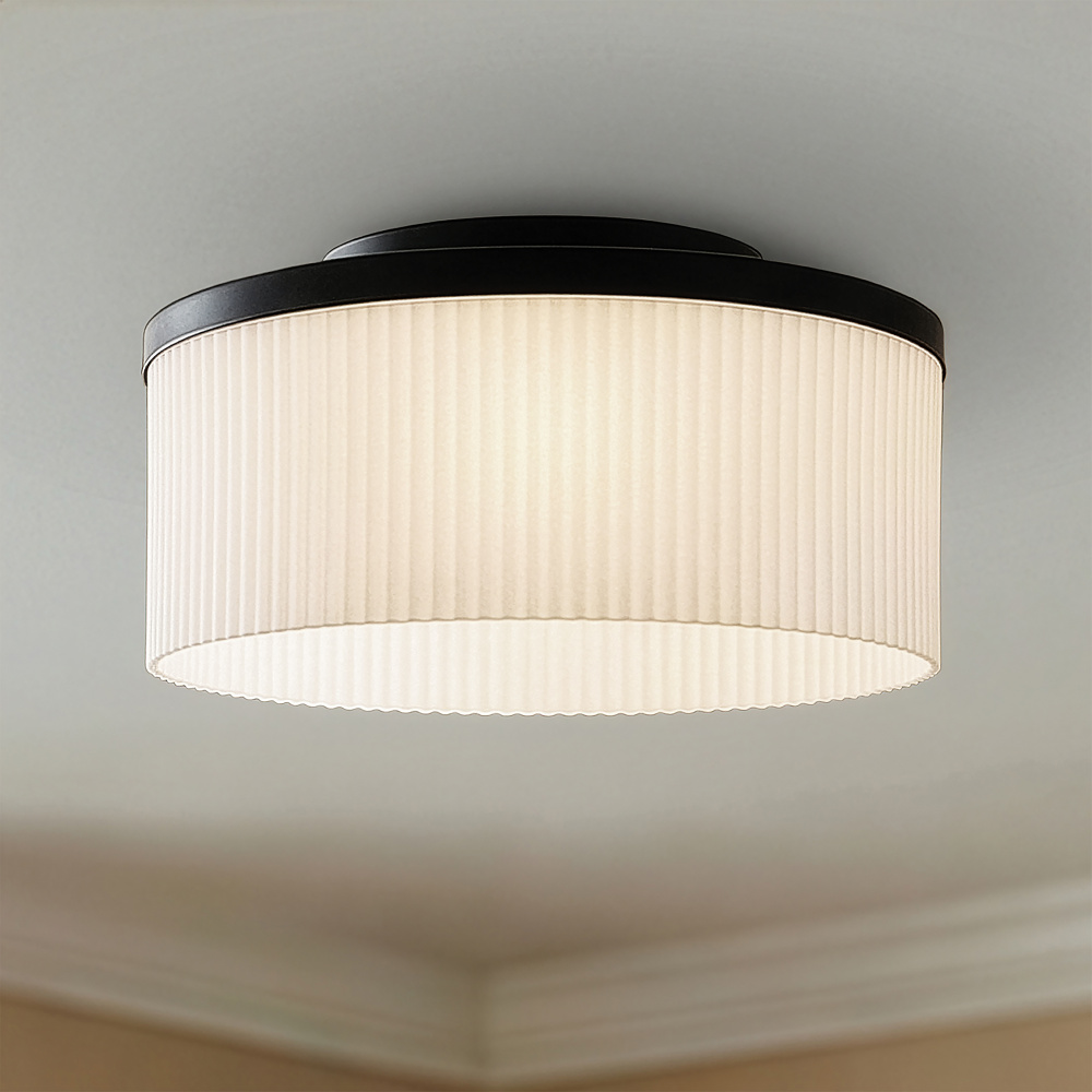 The KINSLEA flush mount embodies quiet confidence, with a matte black finish and subtle texture that creates lighting that feels timeless. Flat opal ribbed glass softens illumination into a warm, even glow, transforming everyday light into something quietly exceptional. Its compact 14" width delivers a refined presence that suits both intimate and expansive spaces, blending seamlessly into bedrooms, hallways, or living areas. Designed for understated elegance, KINSLEA favours craftsmanship and form over flash, offering lasting style. The fixture is as versatile as it is beautiful, bringing both function and artistry to your ceilings. In its simplicity, KINSLEA makes a statement that soothes rather than shouts.