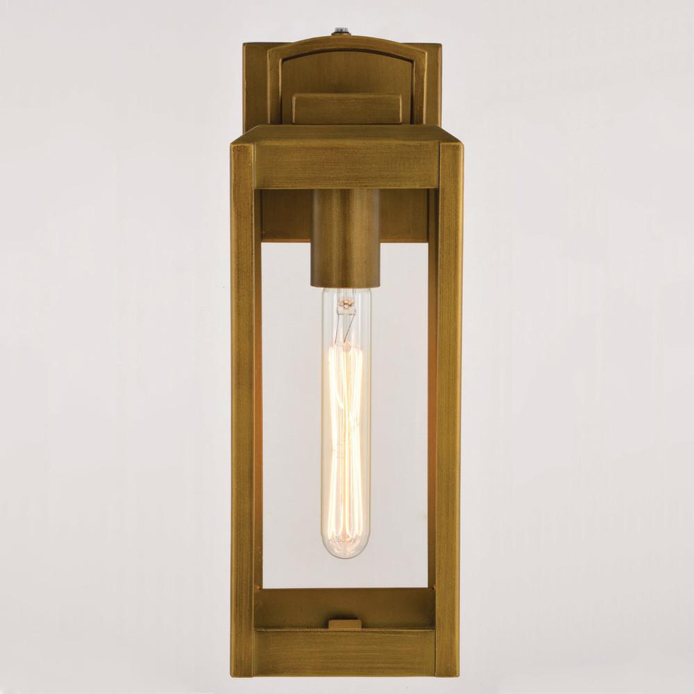 Elongated, slim, clear glass panels frame the Kinzie for a clean, contemporary feel. The oblong lantern handle adds an additional design element to this outdoor wall light collection. Finished in vintage brass, the Kinzie creates a bold but understated look perfect for highlighting your space. Dusk to dawn photo cell automatically turns fixture on in the dark and off in the light for added safety and security, saving energy during daylight hours. Combine that with vintage Edison style filament bulbs to complete the look. This outdoor wall light is ideal for your porch, entryway, garage, or any other area of your home.