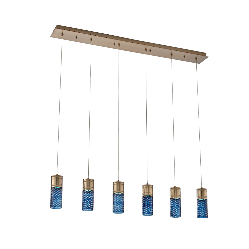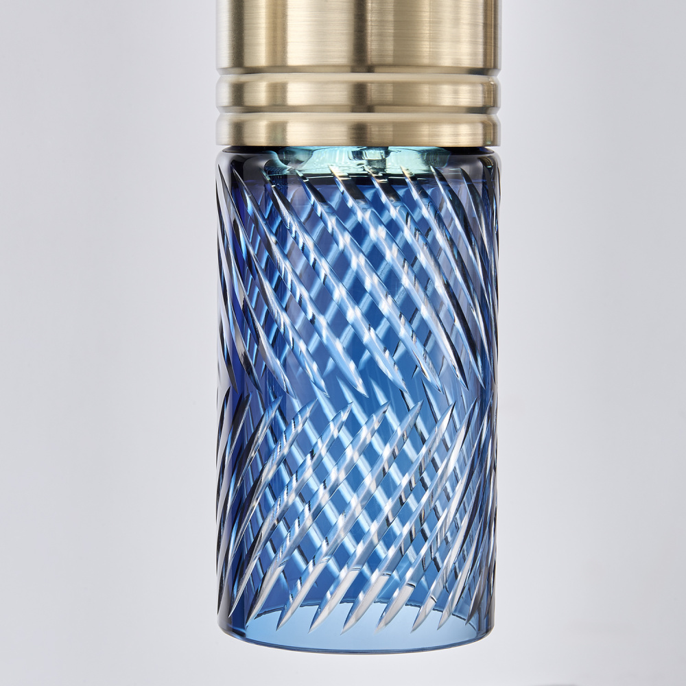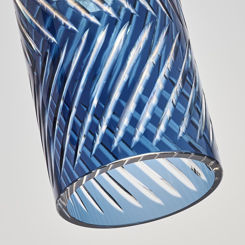 Inspired by the traditional Japanese craft of Edo Kiriko, the indigo colored 24% lead crystal diffusers of this fixture family features precise, herringbone cuts that reveal a clear layer underneath. The aluminum, Winter Brass (WB) body holds each glass in place, and the LED light sources provide ample downlight, adding a functional, yet colorful statement fixture to any space.