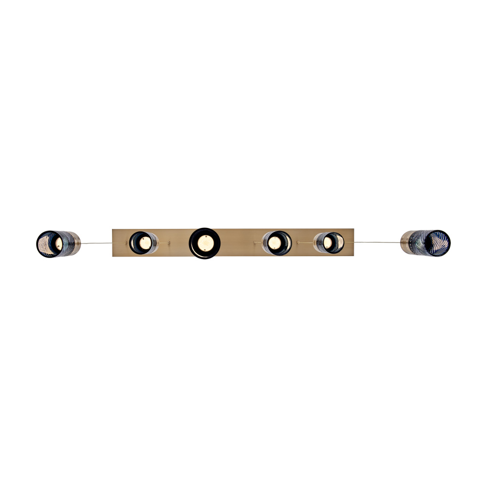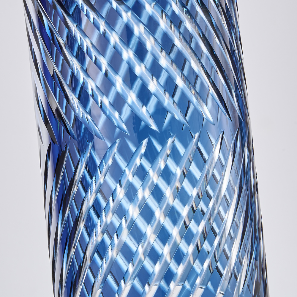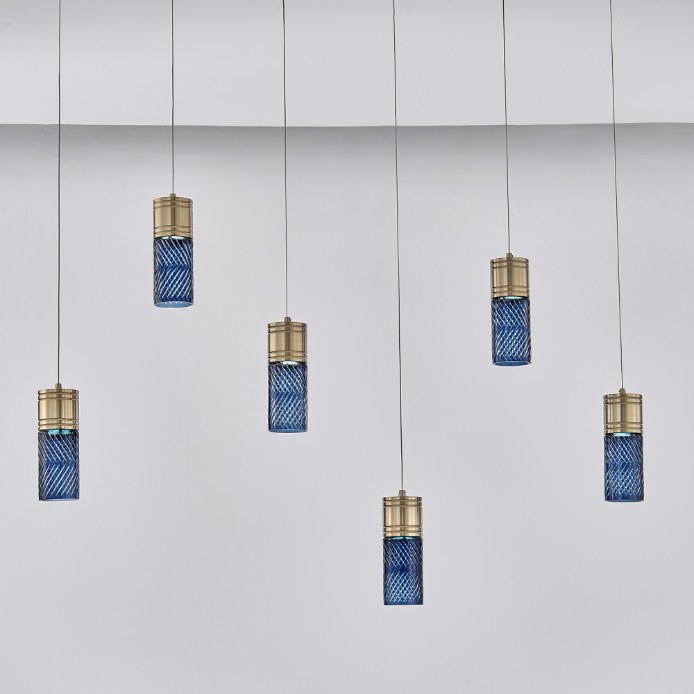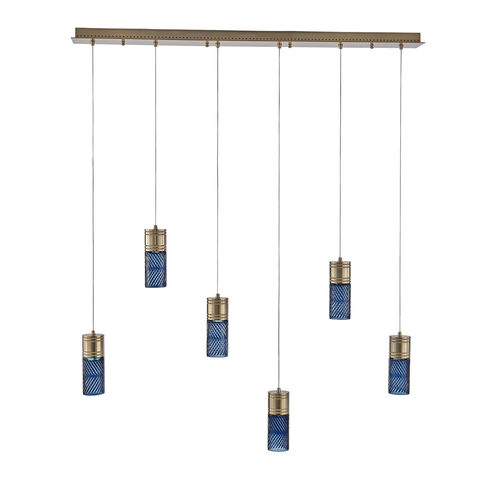 Inspired by the traditional Japanese craft of Edo Kiriko, the indigo colored 24% lead crystal diffusers of this fixture family features precise, herringbone cuts that reveal a clear layer underneath. The aluminum, Winter Brass (WB) body holds each glass in place, and the LED light sources provide ample downlight, adding a functional, yet colorful statement fixture to any space.