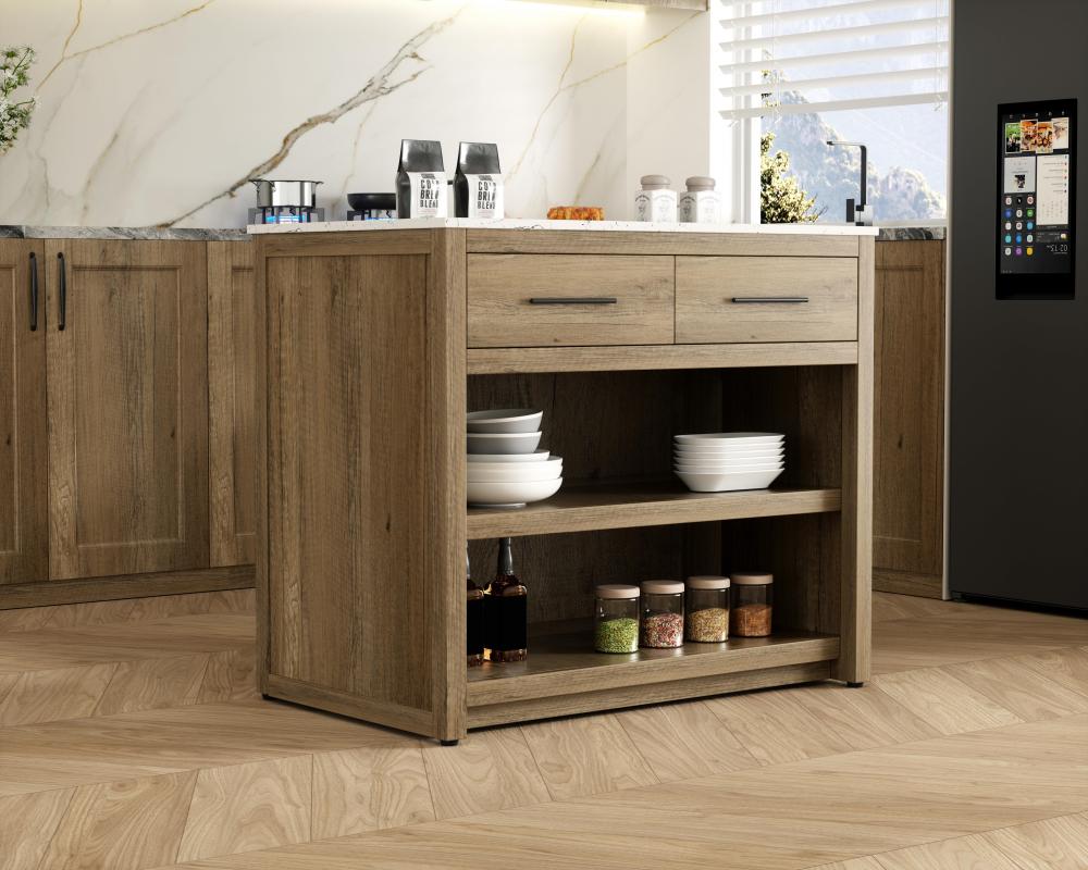Designed for both practicality and style, the island includes two soft-close drawers with French dovetail construction for storing your kitchen tools and an open shelf for additional storage or display. Built from solid wood and MDF, this island is as durable as it is stylish. It’s available in three finishes—blue, natural oak, and white—offering flexibility to complement your kitchen’s aesthetic. with the added convenience of adjustable foot levelers for stability and shipping fully assembled, this kitchen island is ready to elevate your space in no time.