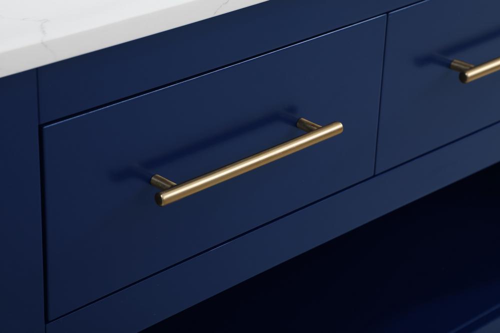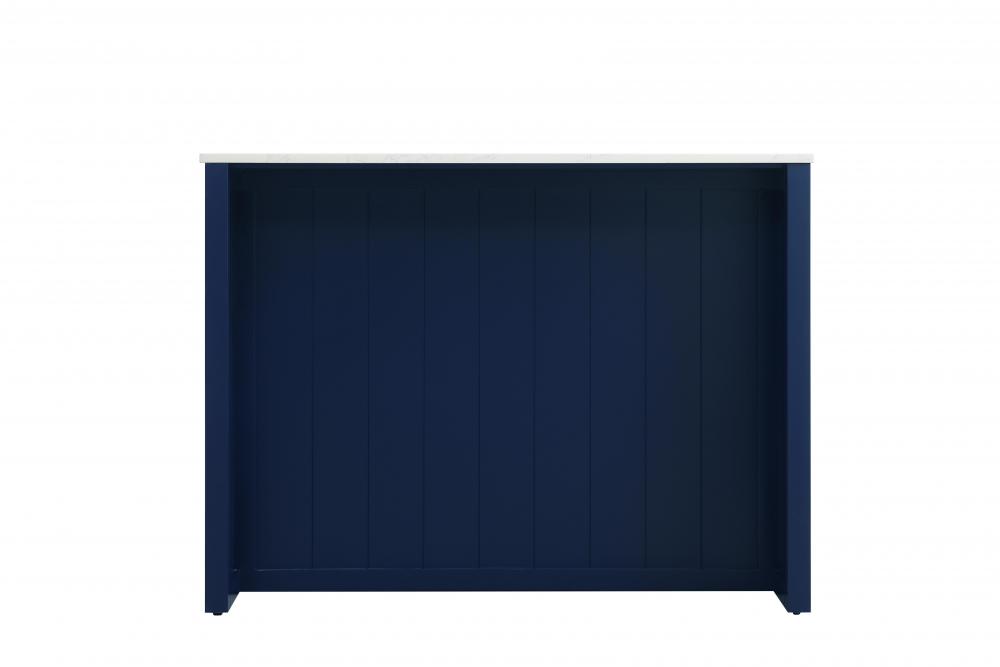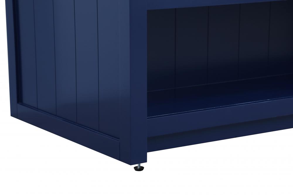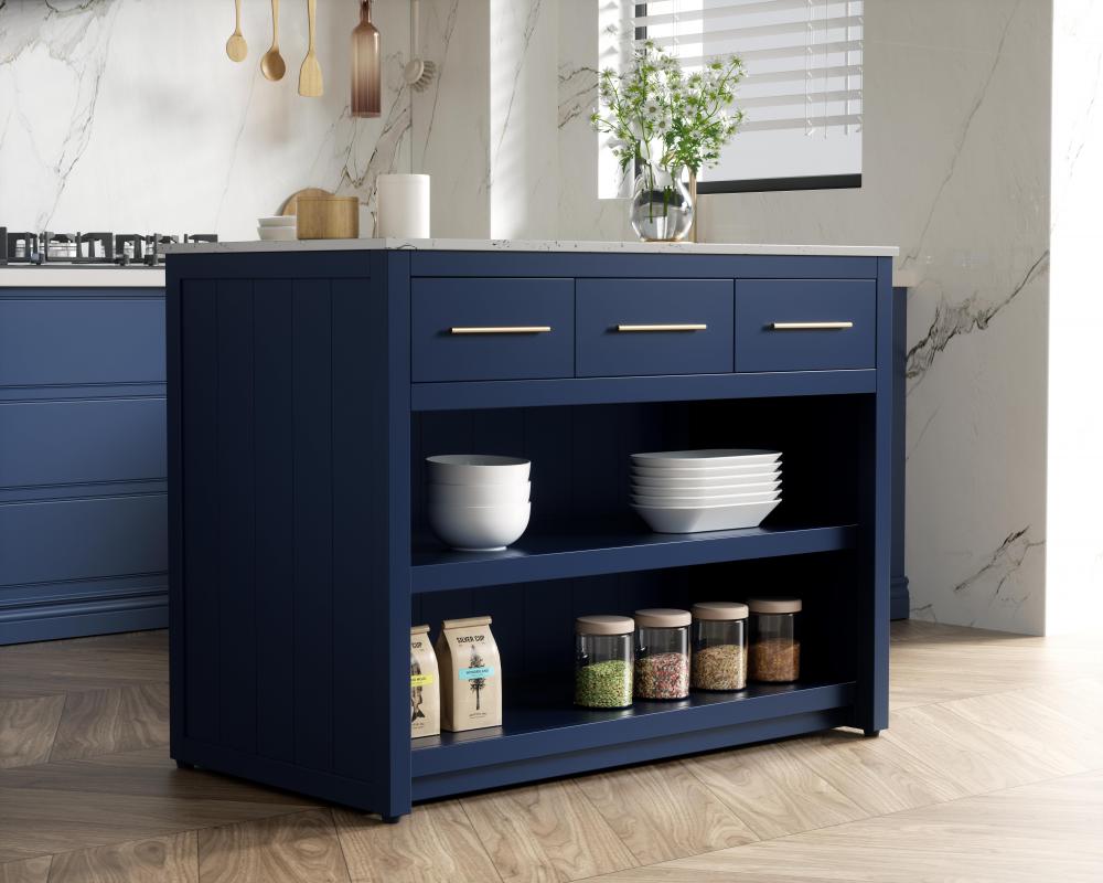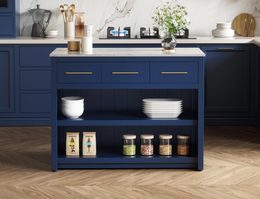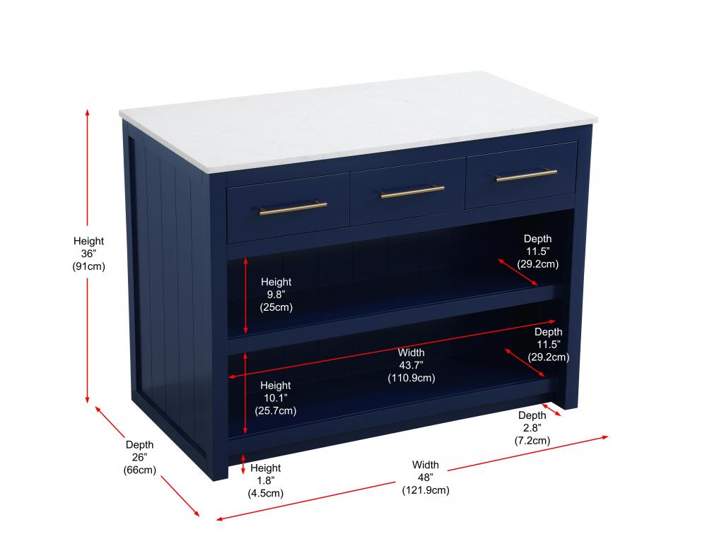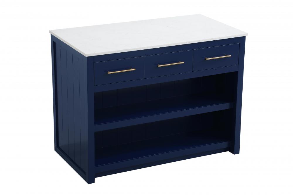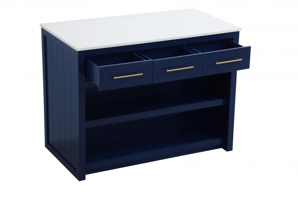 Upgrade your kitchen with this versatile kitchen island that combines functionality and style. Measuring 48" L x 26" W x 36" H, this piece features a sleek engineered marble countertop perfect for meal prep or casual dining. The overhang on one side provides space to seat two barstools, making it an ideal solution for cozy breakfasts or entertaining guests. Designed for both practicality and style, the island includes three soft-close drawers with French dovetail construction for storing your kitchen tools and an open shelf for additional storage or display. Built from solid wood and MDF, this island is as durable as it is stylish. It’s available in three finishes—blue, natural oak, and white—offering flexibility to complement your kitchen’s aesthetic. with the added convenience of adjustable foot levelers for stability and shipping fully assembled, this kitchen island is ready to elevate your space in no time.