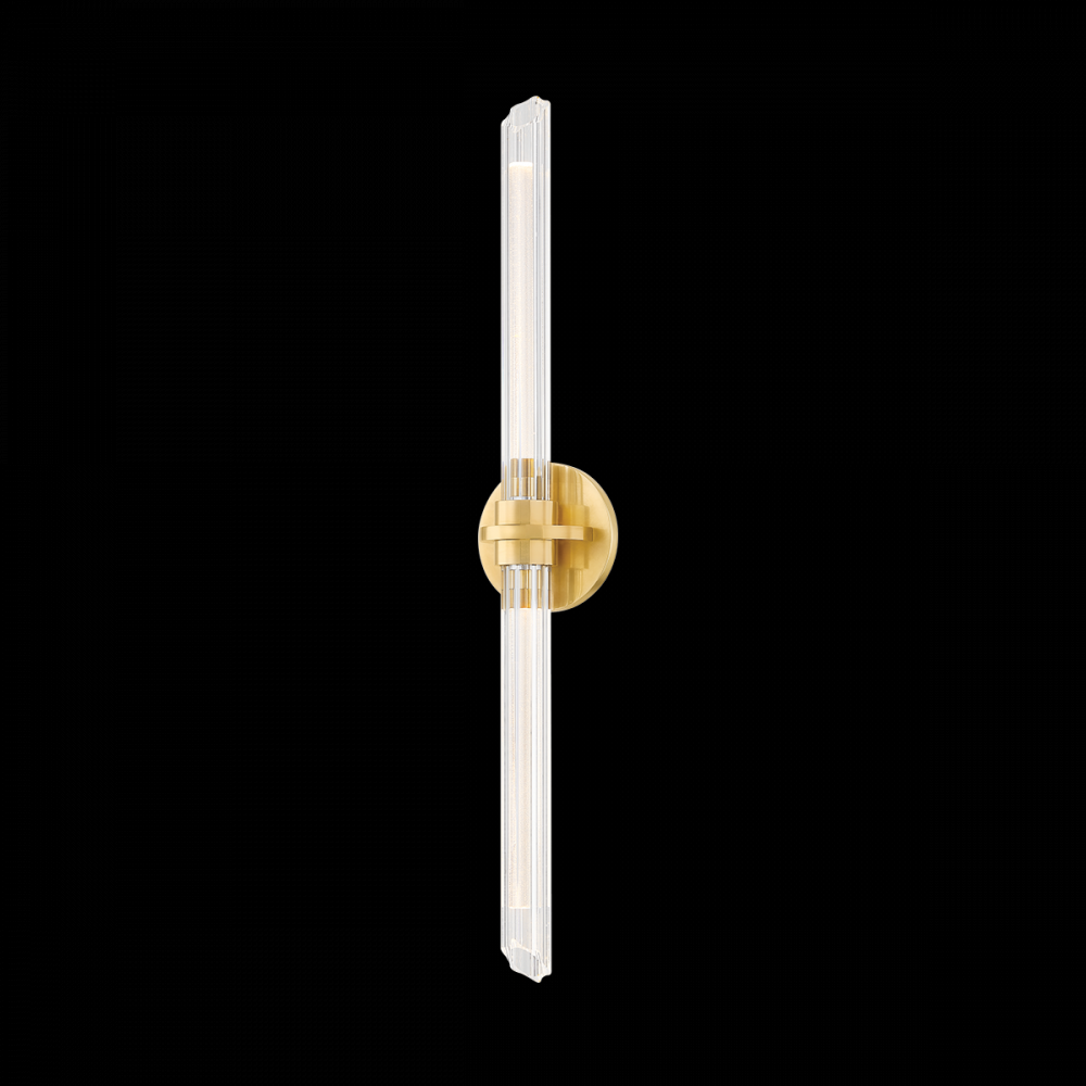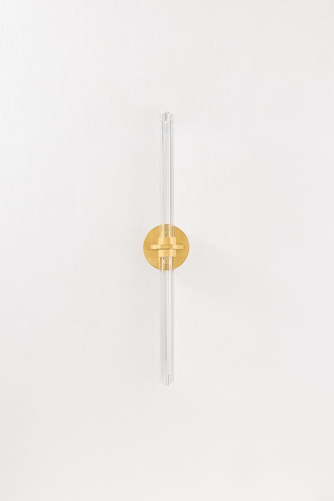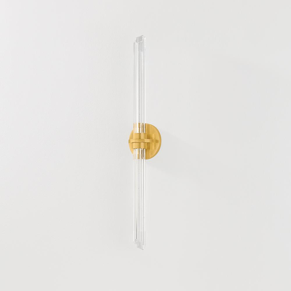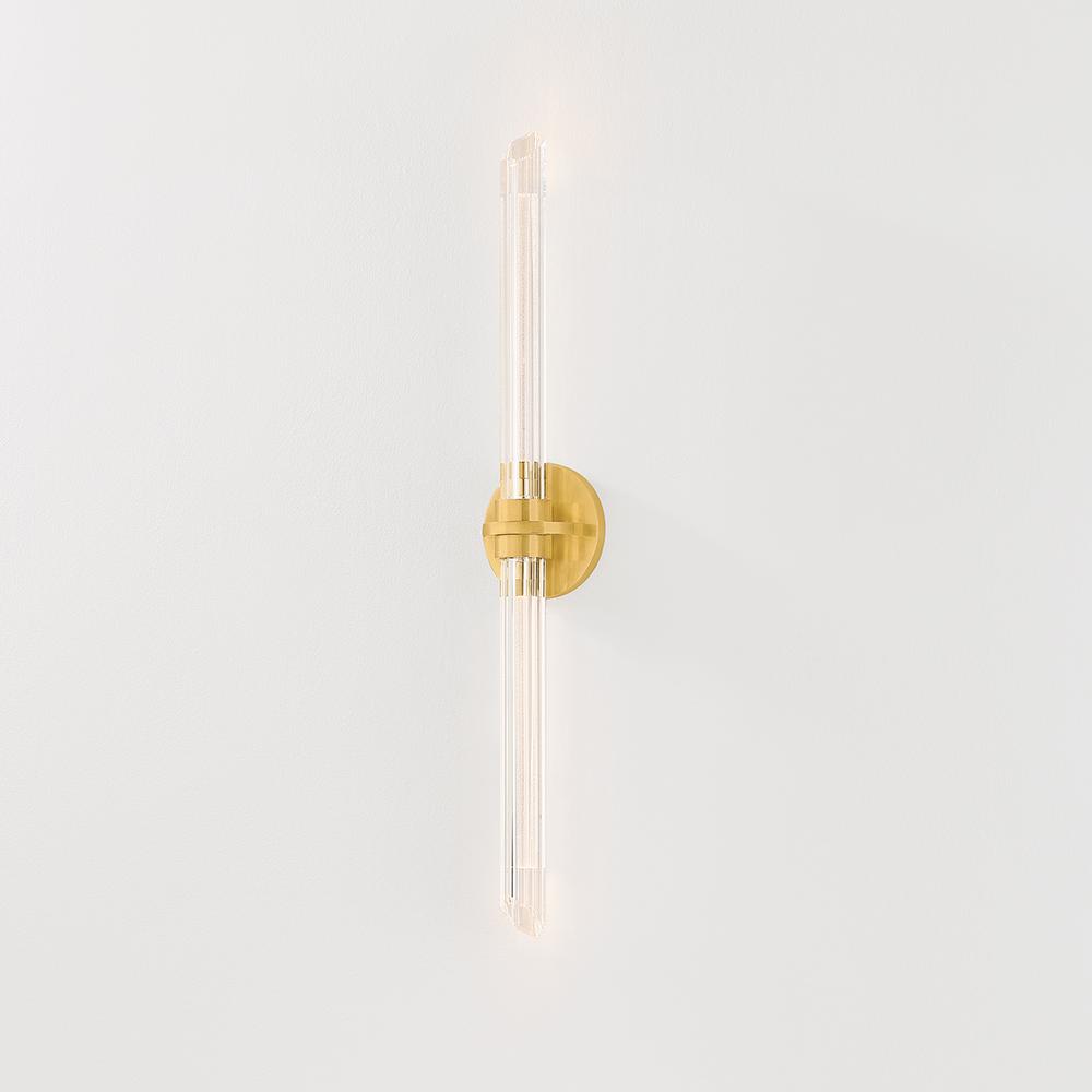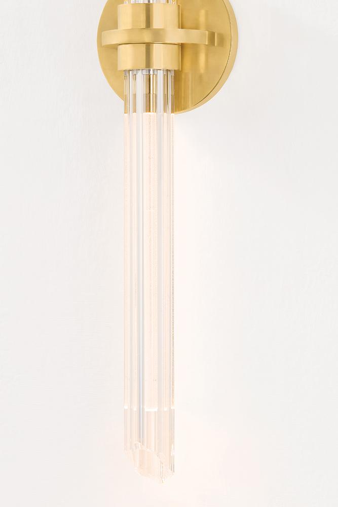 Designed to provide ambient lighting in a bath area, Knighton features a slender glass rod design with integrated LED. The faceted, clear extruded glass creates a layered effect, adding texture while creating a soft diffusion of light. The minimal Aged Brass metalwork is positioned both inside and outside the glass, heightening the dimensionality of this upscale sconce.
