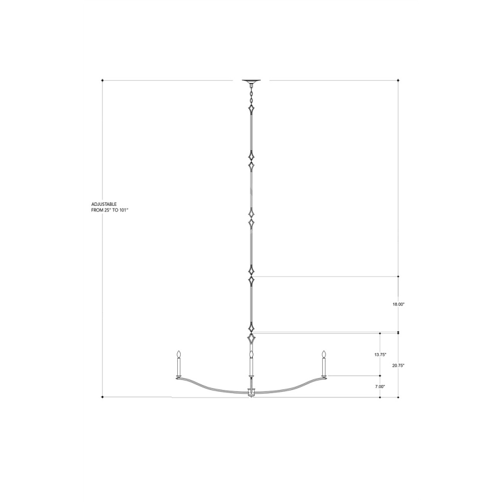 The Knole Chandelier gleans its simple beauty from the minimalistic design of its wrought iron frame. This is heightened by the chain-link detail ornamenting the top of the stem from which it hangs. of particular note on this black chandelier in a French black finish is how subtly the arms curve. Adjustable from 25" to 101" with use of included chain/rod kit/cable. If your space calls for a longer drop, additional chain/rods/cable is available for purchase.