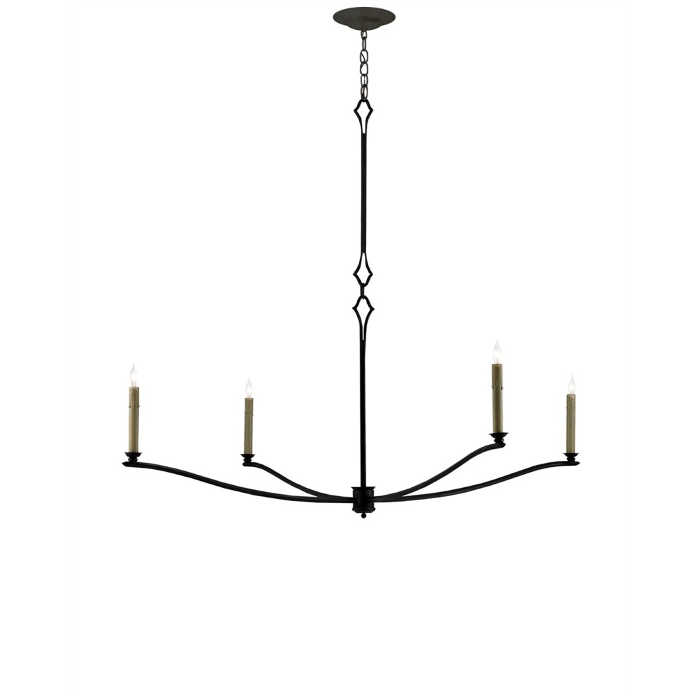 The Knole Chandelier gleans its simple beauty from the minimalistic design of its wrought iron frame, which is relieved ever so slightly by the detail ornamenting the top of the stem from which it hangs. Treated to a French black finish, the chandelier’s slightly curved arms reach out to an impressive 49 inches in diameter.