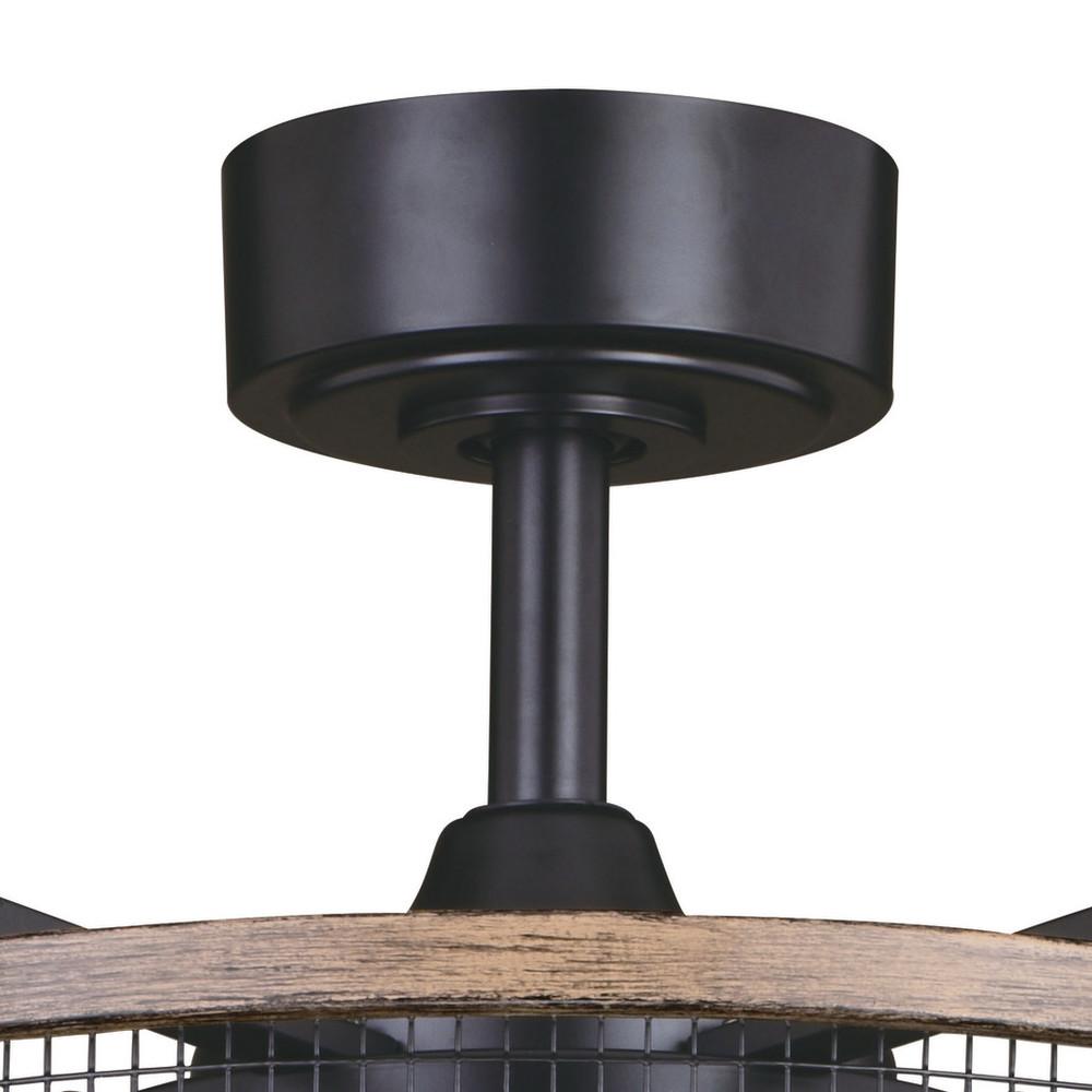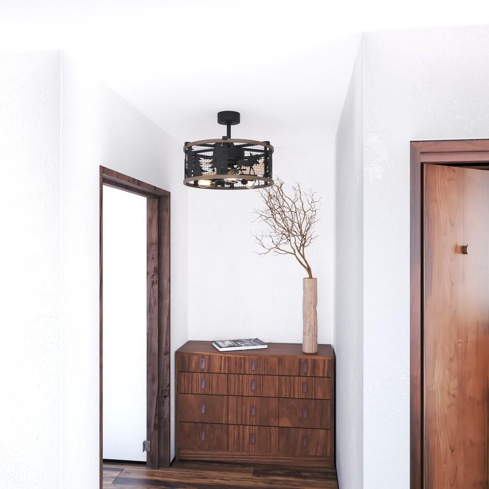 Get wild with this indoor-outdoor drum style ceiling fan called Kodiak. The pairing of the black and burnished teak finishes enhance the on-trend metal cage perfectly. Capture your love of nature with pine tree and moose silhouettes. It is a great choice for a vacation lodge, cabin or suburban home and will complement a variety of home styles: anywhere you want to bring in an element of nature. The included LED bulbs provides energy saving, low maintenance and long-lasting performance. Rated for damp locations, ideal for your covered porch, family room, or any other area of your home.
