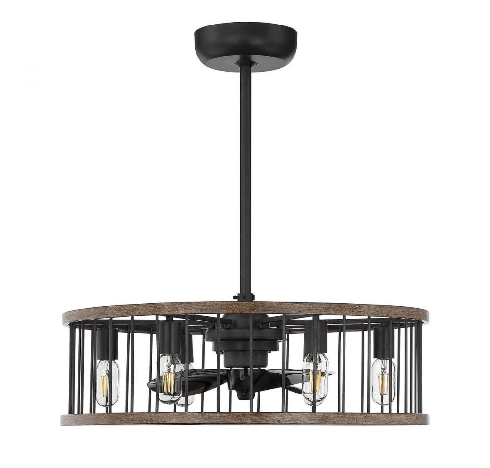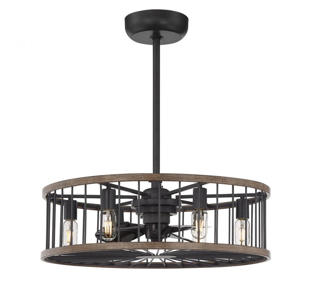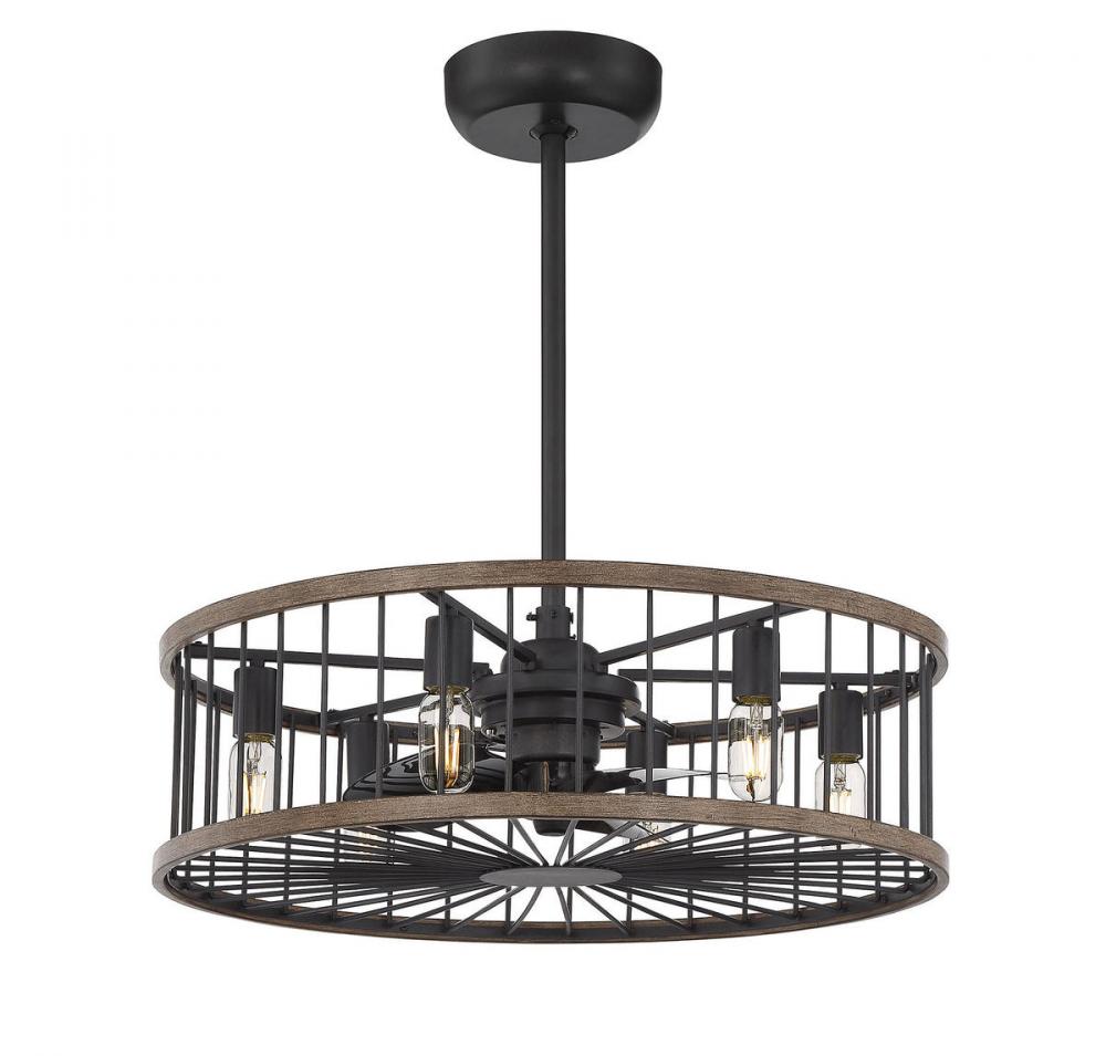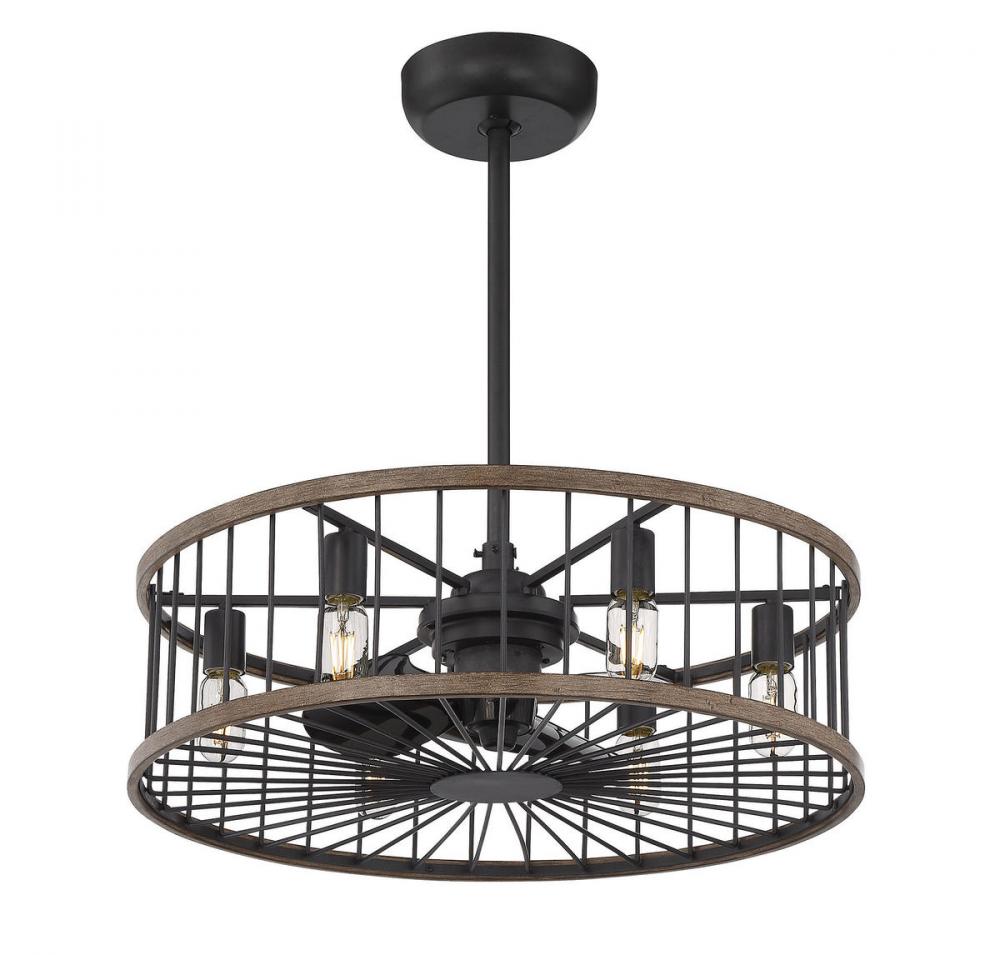 Say aloha to the Savoy House Kona Fan D'Lier! Your home can be a paradise with the comfortable air and the casual style of this fixture. Its inner fan has a 3-speed motor and 14" blade span for maximum cooling. The airy cylindrical frame features vertical bars and eight 6W LED bulbs (included) to provide plenty of illumination. This Fan D'Lier is finished in black with accents of mahogany-like, tropical sapele wood around the frame. The bulbs are dimmable and a full-function handheld remote control is included, so you have independent control over the light and the fan at your fingertips. Because it's UL listed for damp locations, you can bring stylish comfort to both your indoor and covered outdoor living areas.