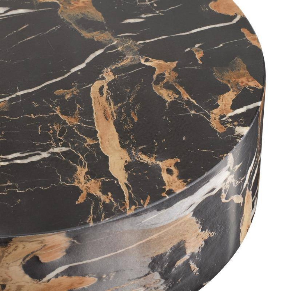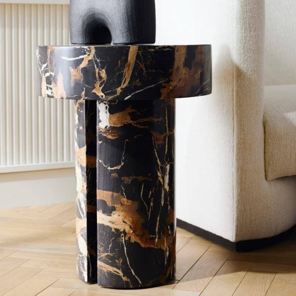The texture and finish of petrified wood sculptures influenced the modern mix of shades found in our espresso & white hydroprint end table. Cast from concrete composite, this minimalist style is finished with a hatched base. Finish will vary.