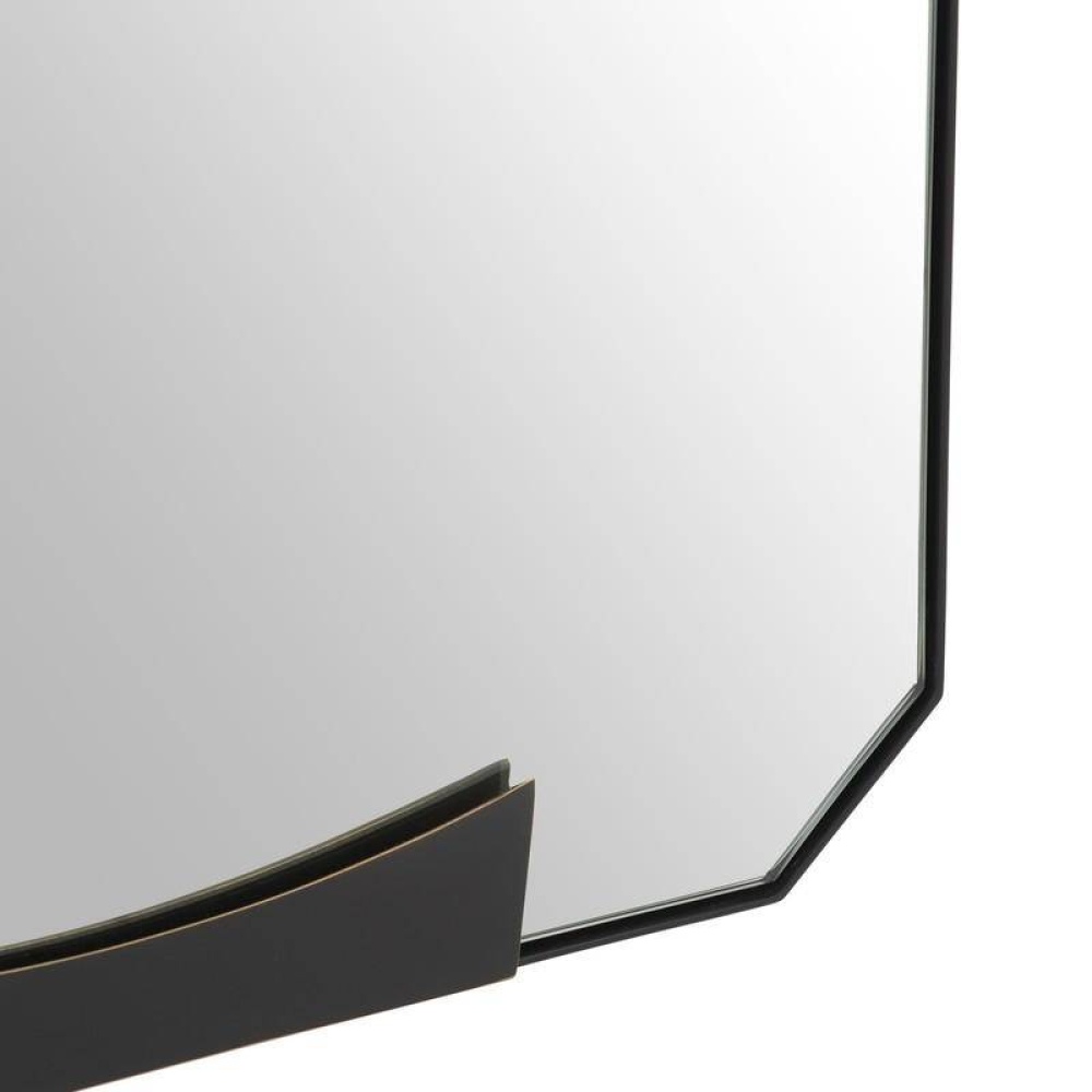 Elegantly modern, the Kris Rectangular Mirror displays a refined geometric design. Gracefully formed brass clasps hold this mirror top and bottom, all in a bronze finish over a blackened iron frame. The raised design creates depth and adds chic sophistication. Security cleat hanging hardware included and allows for vertical or horizontal display.