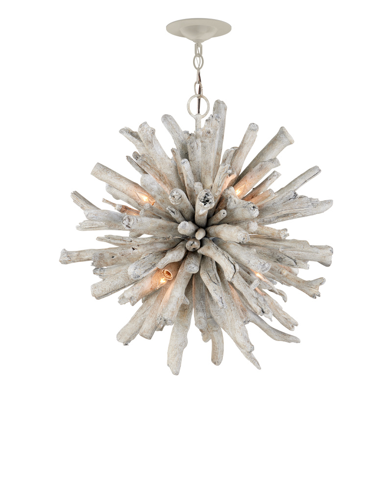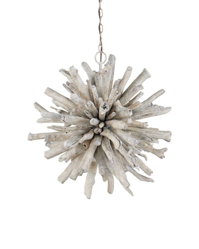 The Kuka Pendant is a driftwood starburst in a whitewashed driftwood finish, which was designed by Marjorie Skouras to continue her celebration of the Yucatan Peninsula that she calls home. The tumbled wood pieces are fitted so carefully to the frame, the nature-inspired profile fools the eye into thinking it came from the elements in one piece. This natural-toned pendant is a perfect choice for coastal settings and lakeside retreats. Adjustable from 31.5" to 99.5" with use of included chain/rod kit/cable. If your space calls for a longer drop, additional chain/rods/cable is available for purchase.