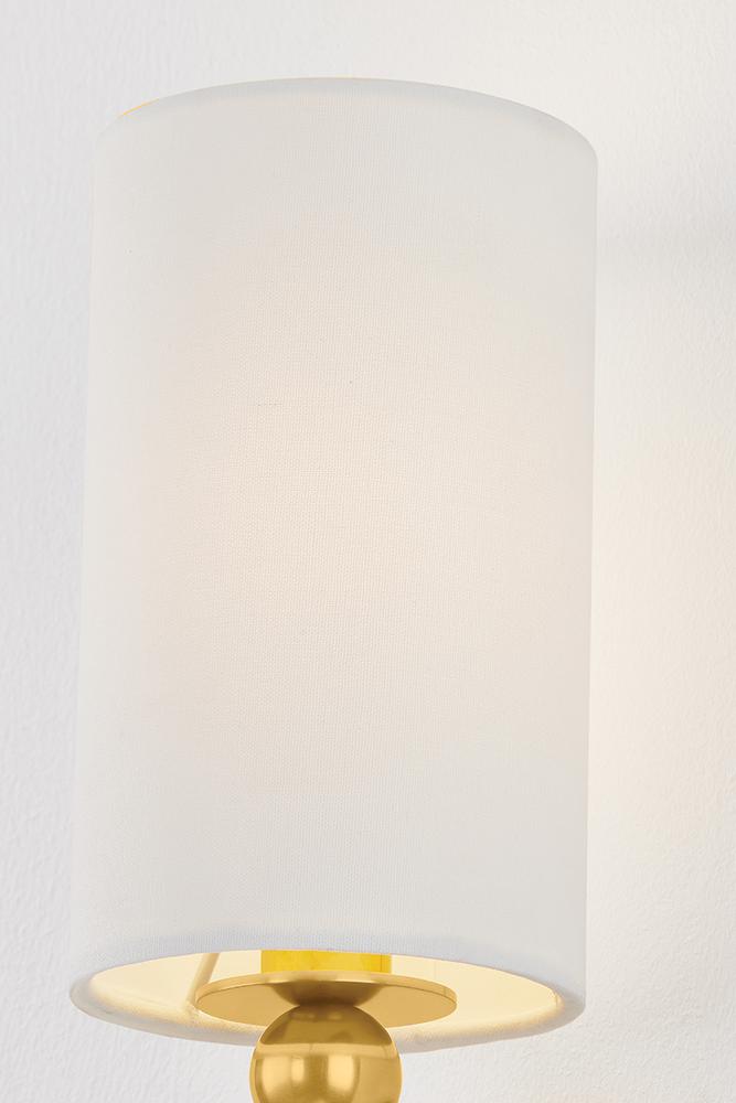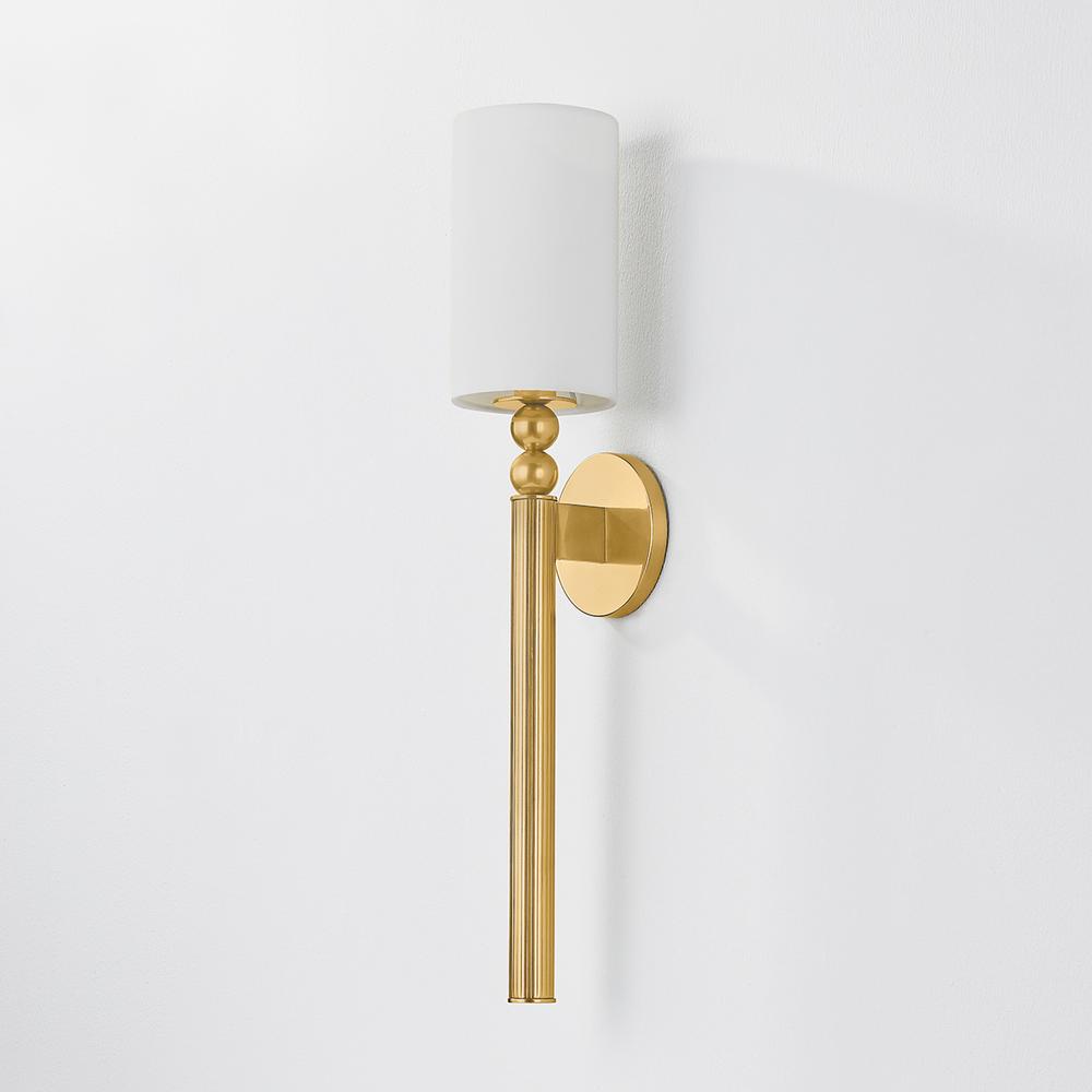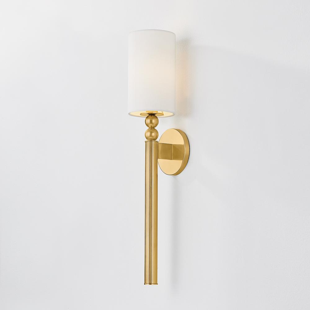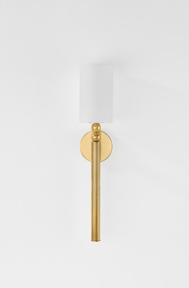 The beauty of Lakeport lies in its dignified, understated details. This slender sconce features a classic torch silhouette marked by distinctive metalwork. A vertically fluted tail supports a series of stacked decorative spheres, creating a softly modern rhythm. Topped with a small cylindrical shade and finished in Aged Brass or Vintage Pewter, Lakeport adds refinement to a bedside or powder room.
