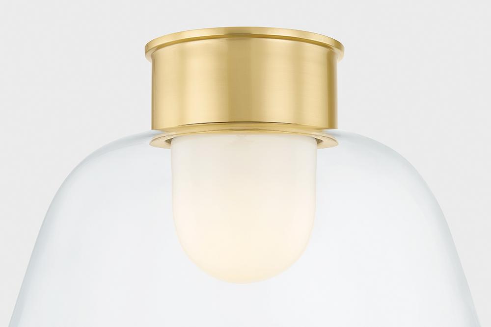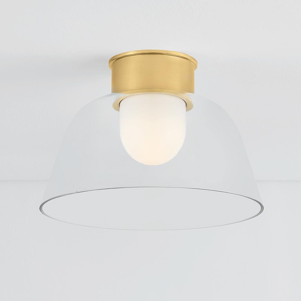 A celebration of the beauty of pared-down forms, Lakeside features an opal glossy inner diffuser surrounded by a clear outer glass layer. Shaped like a graceful bowl, this flush mount forgoes ornamentation save for its extra-tall metal canopy. Available in Aged Brass or Distressed Bronze finishes, the streamlined metalwork adds a decorative note to the minimalistic design.