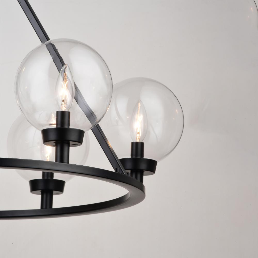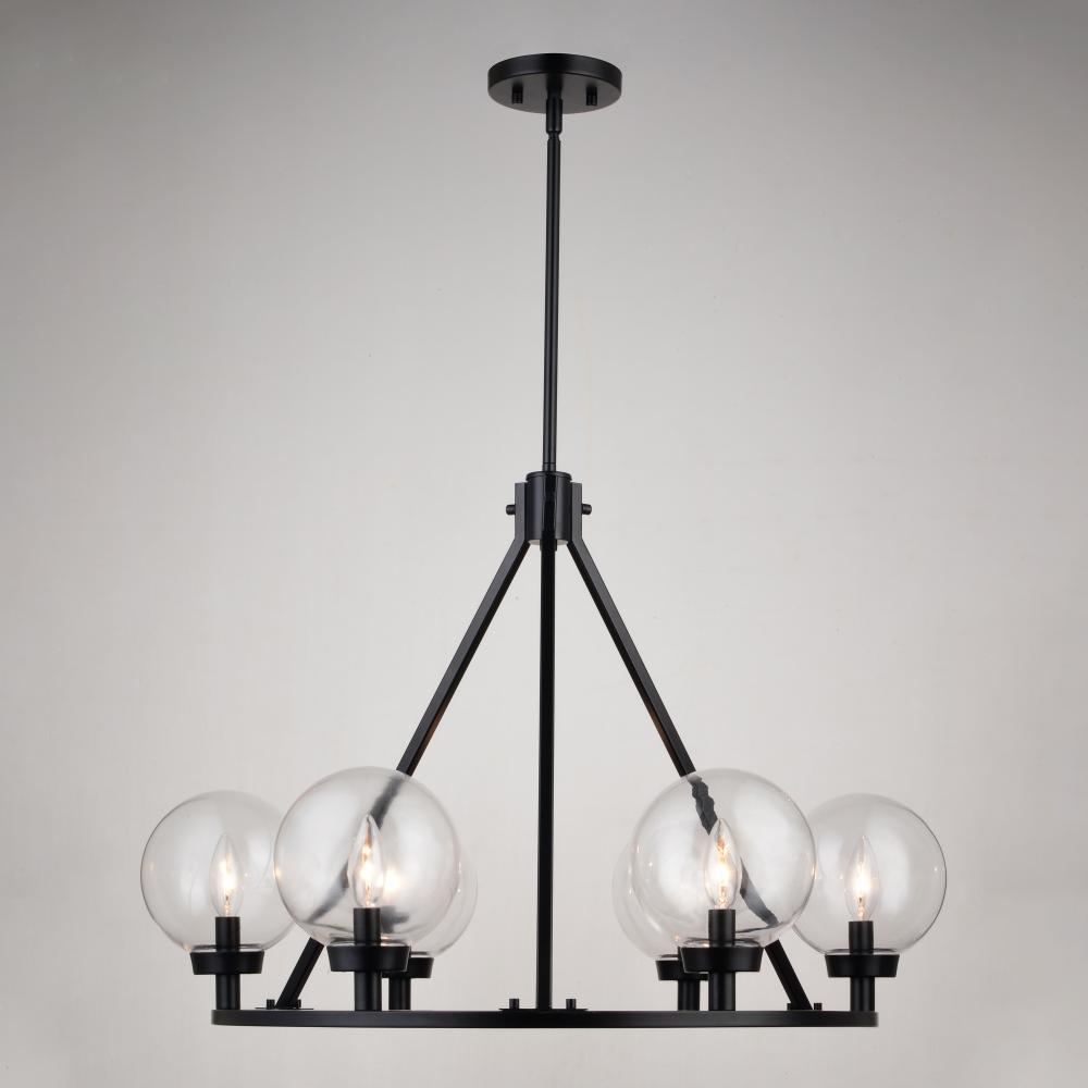 The Lander interior lighting collection is contemporary style with flair. A distinctive metal ring finished in matte black supports and highlights the clear glass globe shades. Hung with down rods suitable for vaulted ceilings, this chandelier light fixture is a perfect addition to your dining area or any other living area where a little extra style is desired.