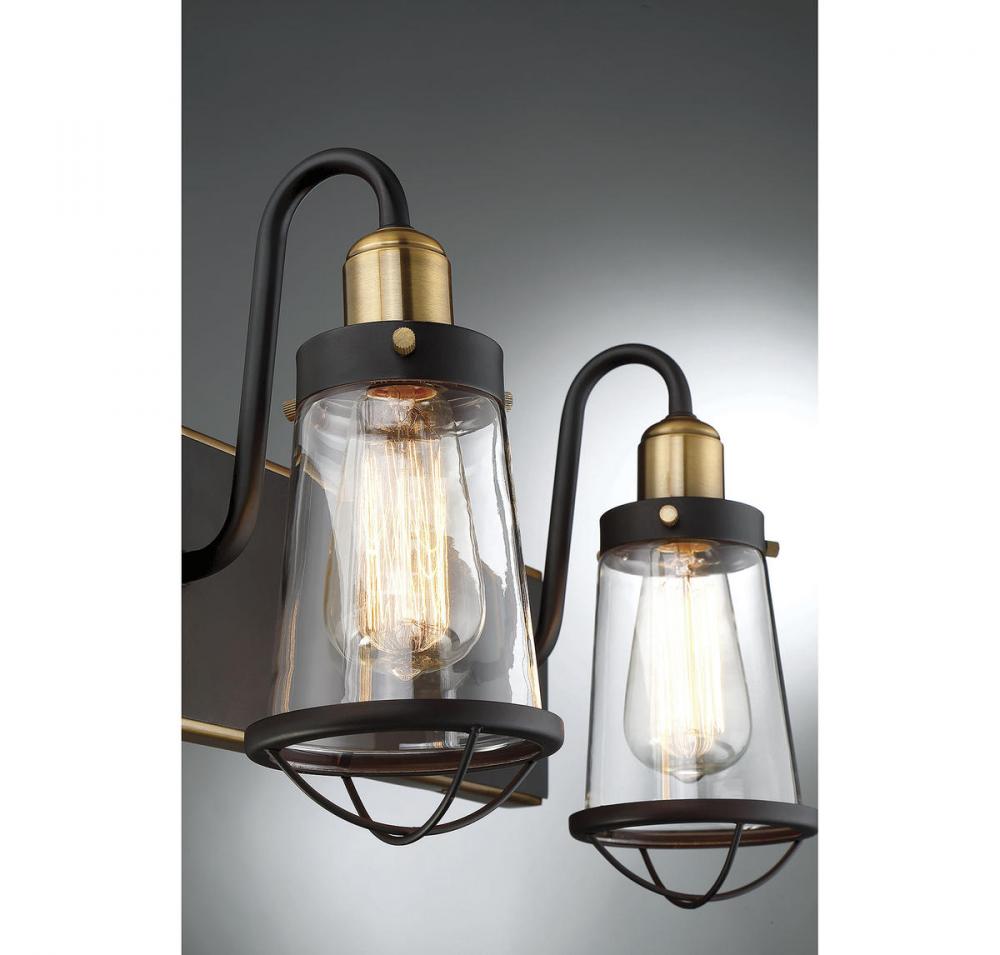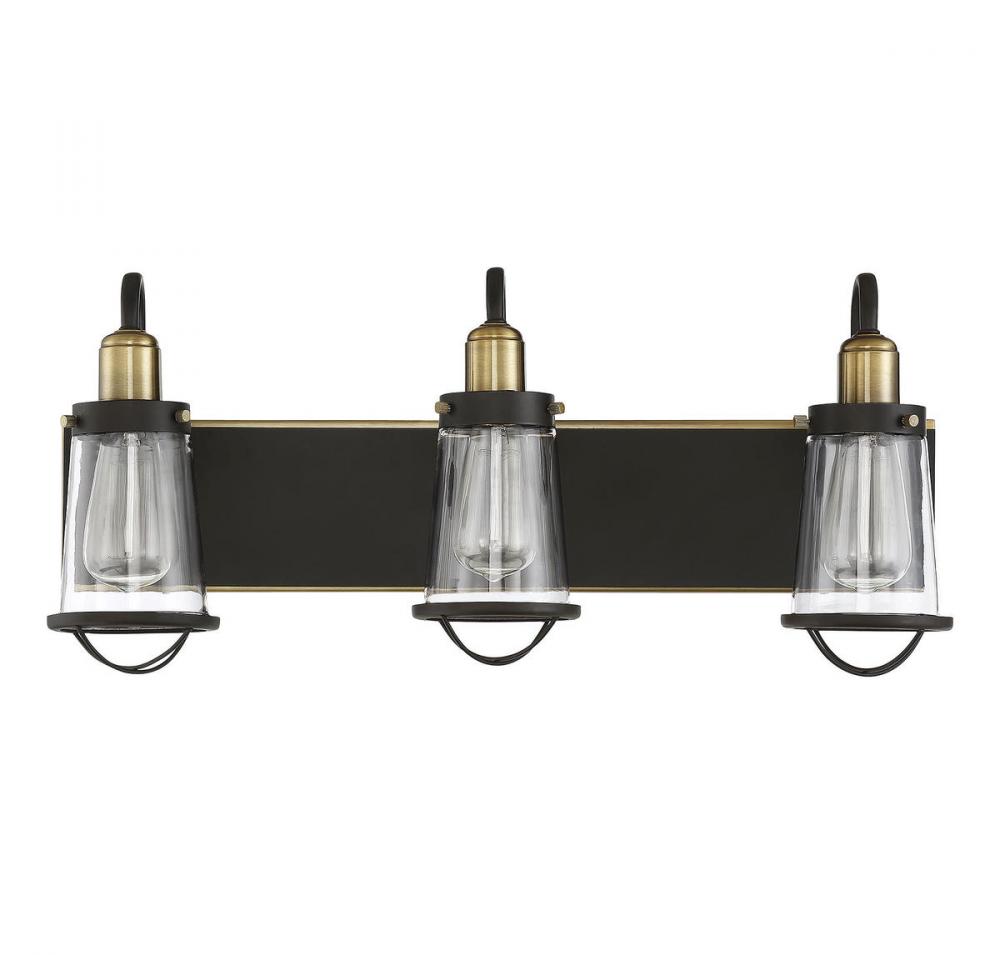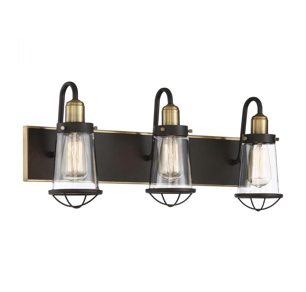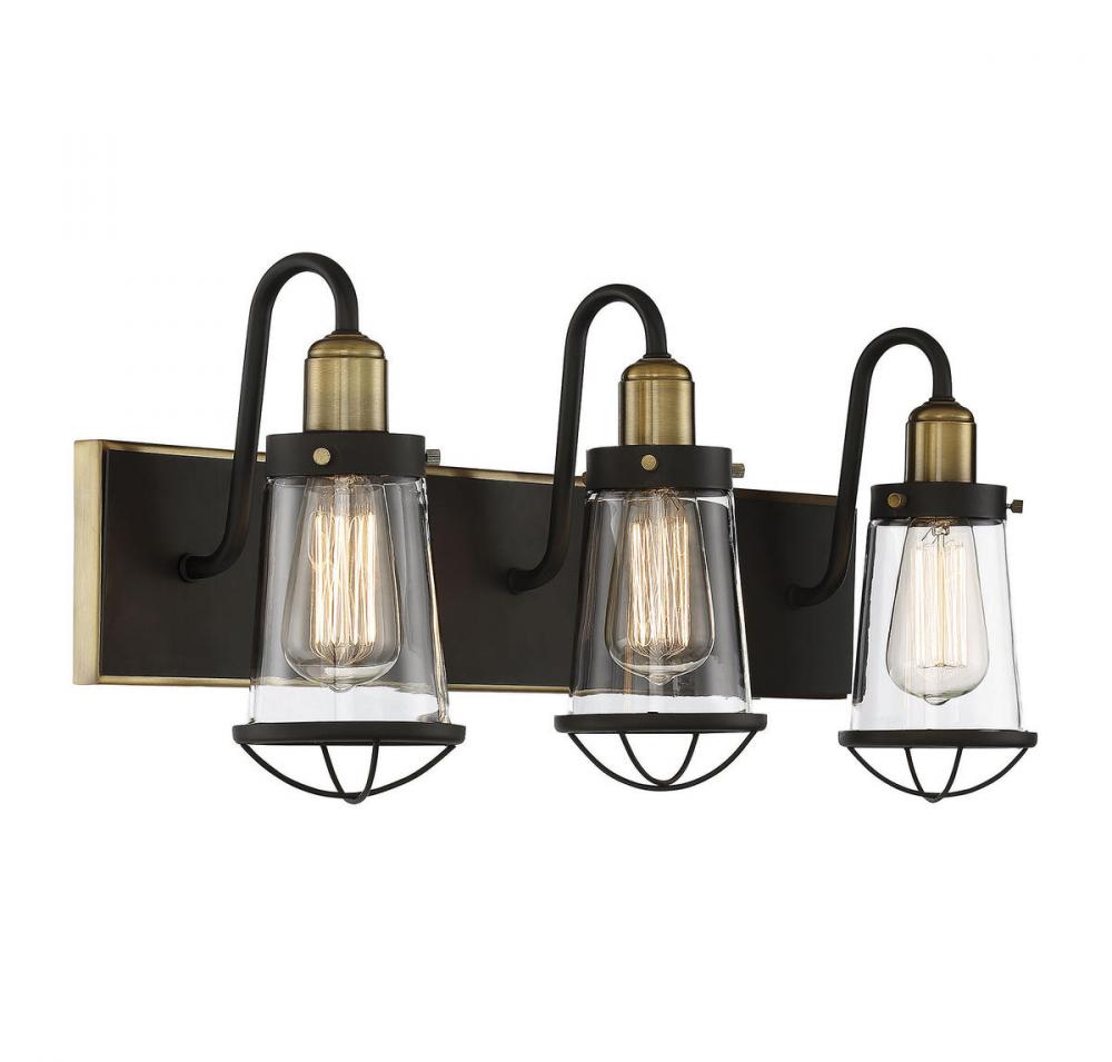 Industrial-inspired design, like this Savoy House Lansing 3-light bath bar, brings a vintage look to your home. The classic style is an excellent fit with industrial chic, modern farmhouse, urban loft, transitional and eclectic decor. This bath bar features a sturdy rectangular wall plate, curved light arms and cage-like details on the shade. The entire frame has a beautiful English bronze finish with bright warm brass accents. The slim tapered shades are made of clear glass, allowing the light from two 60W standard size bulbs to shine above your vanity. This fixture is 13.5" wide, 10" high and extends 7" from the wall. It's an impeccable choice for vintage industrial elegance in your bathroom or powder room.