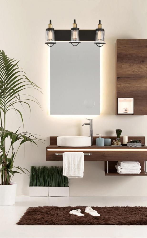 Industrial-inspired design, like this Lansing bath bar, brings a solid, practical, and vintage aesthetic to your home. The classic style is an excellent fit with industrial chic, modern farmhouse, urban loft, transitional, and eclectic decor. This bath bar features a sturdy rectangular wall plate, curved light arms, and cage-like details on the shade. And the entire frame has a beautiful, dark, English bronze finish with bright, warm brass accents. The slim tapered shades are made of clean, clear glass, allowing the light from three 60W, E-style bulbs to shine above your vanity. This fixture is 24” wide, 10” high, and extends 7” from the wall. It’s an impeccable choice for vintage industrial elegance in your bathroom or powder room.