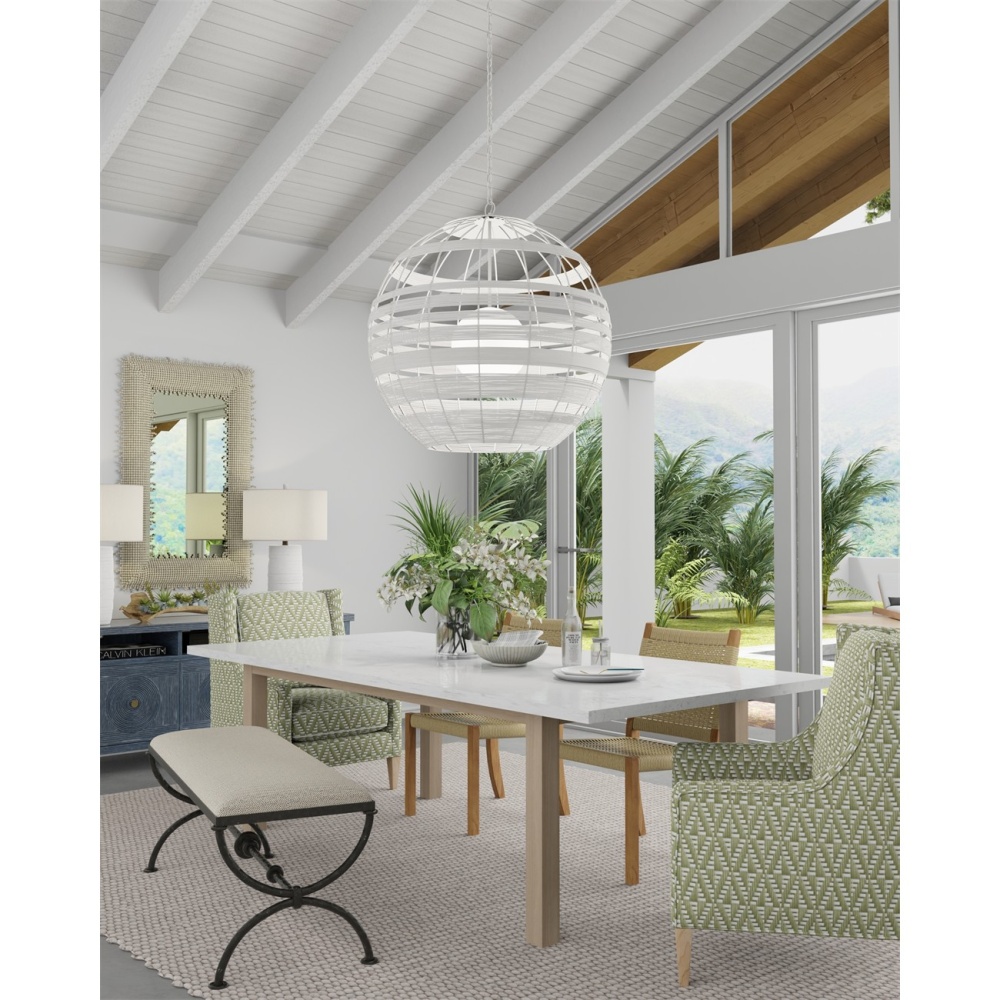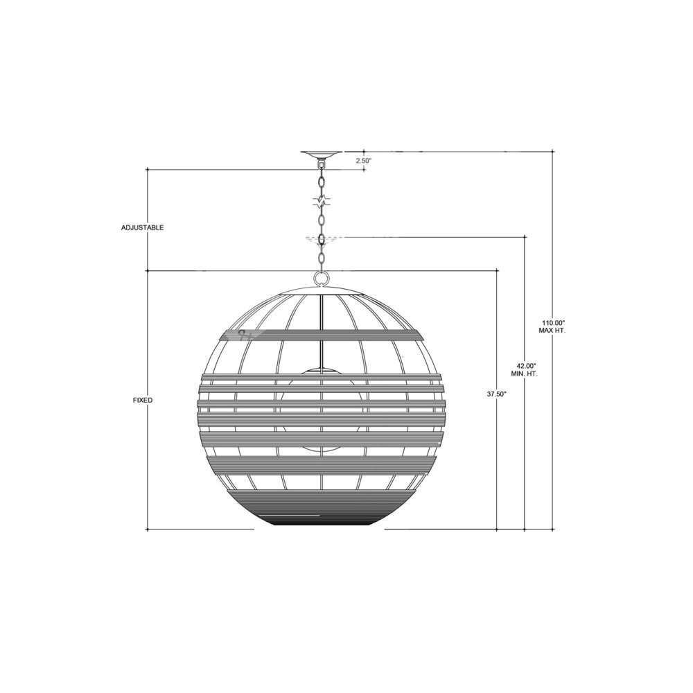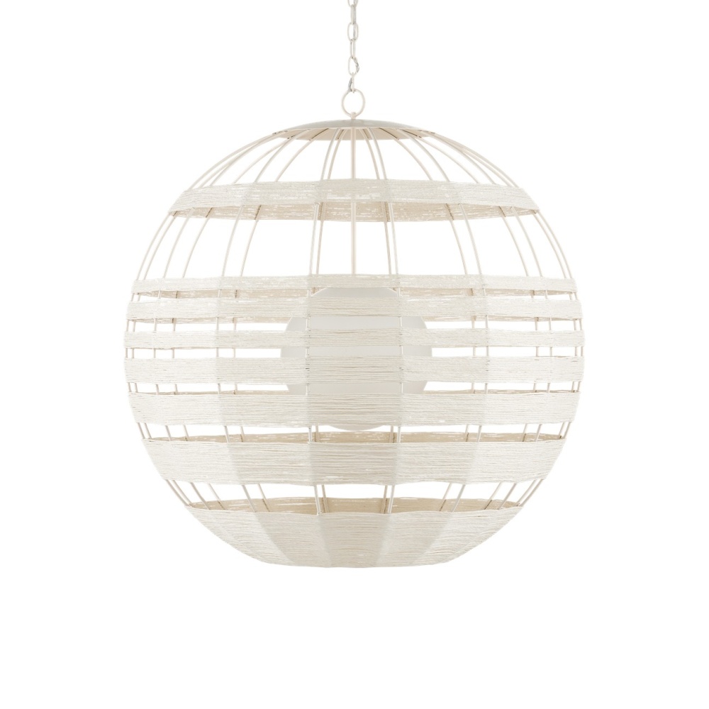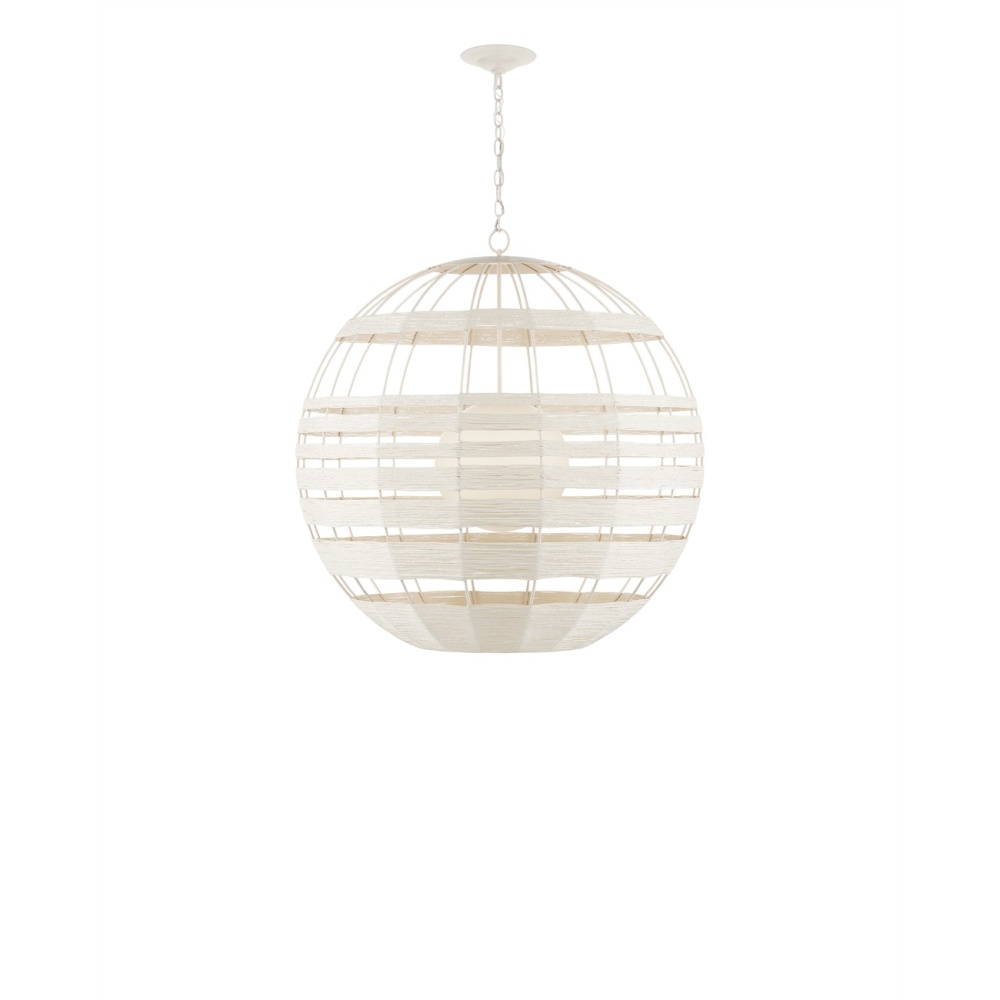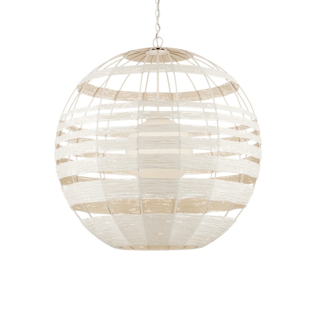 Inspired by the planet Jupiter, the Lapsley Orb Chandelier features irregular bands of twisted Kraft paper twine. The globe cage wrapped by the string is completed in a vanilla finish; the pale intermingling of materials making this a stunning design. A white frosted glass globe evenly distributes the light on this overscaled white chandelier. Adjustable from 42" to 110" with use of included chain/rod kit/cable. If your space calls for a longer drop, additional chain/rods/cable is available for purchase.