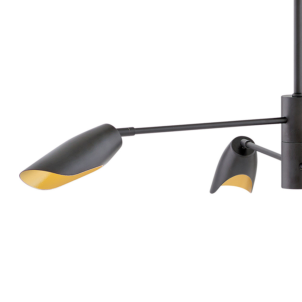 Bowery draws its inspiration from kinetic artistry. The thrilling sculptural silhouettes are evocative of free-moving mobiles from the early 20th century and inject any space with intrigue. The contemporary LED chandeliers and sconces feature pivoting arms and shades in three striking color combinations for maximum impact. Bowery is available in Black with Banker Brass accents; or a Heritage Brass.