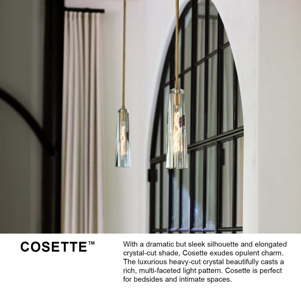 With a dramatic but sleek silhouette and elongated crystal-cut sconce shades, Cosette exudes opulent charm. With two luxurious heavy-cut crystal shade options, smokey gray or clear, both beautifully cast a rich, multi-faceted light pattern. Cosette's sconce includes an elegantly concealed on/off switch, making it perfect for bedsides and intimate spaces pattern.