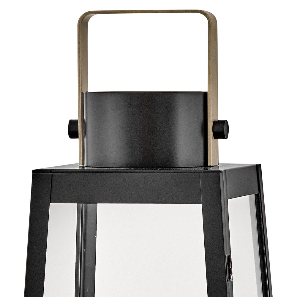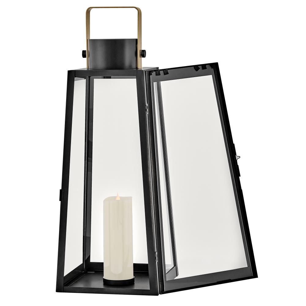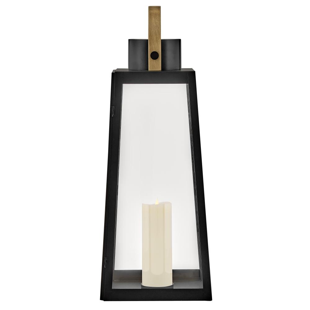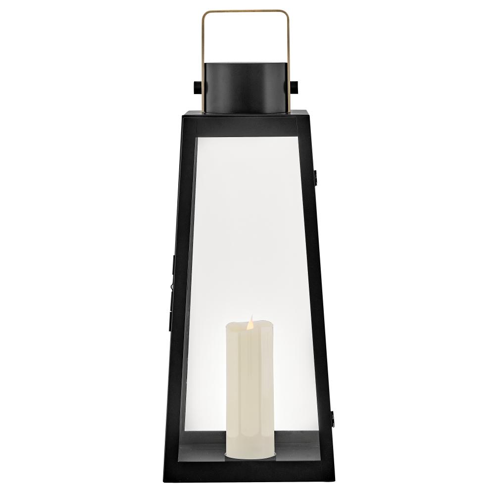 Hype up your alfresco area with the Hugh Decorative Lantern and its sleek, transitional style. The trapezoidal design features bold, over-scaled clear glass panes paired with a bold metal frame to inject a modern edge. with this decorative lantern, you can take the light where you need it, whether that's on a porch, a screened-in patio, or next to an inside fireplace. with an LED faux flame wick candle included, it's easy to make Hugh pop inside or out, with no electrical wiring required.