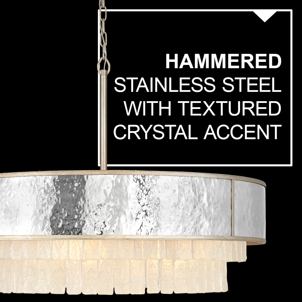 Reverie features a fanciful combination of finishes and shapes to create an opulent transitional silhouette. The robust, hammered stainless steel drum encompasses the textured crystal accents, which create a stunning profile from below. Metal binding adds an artisan touch that completes the look.