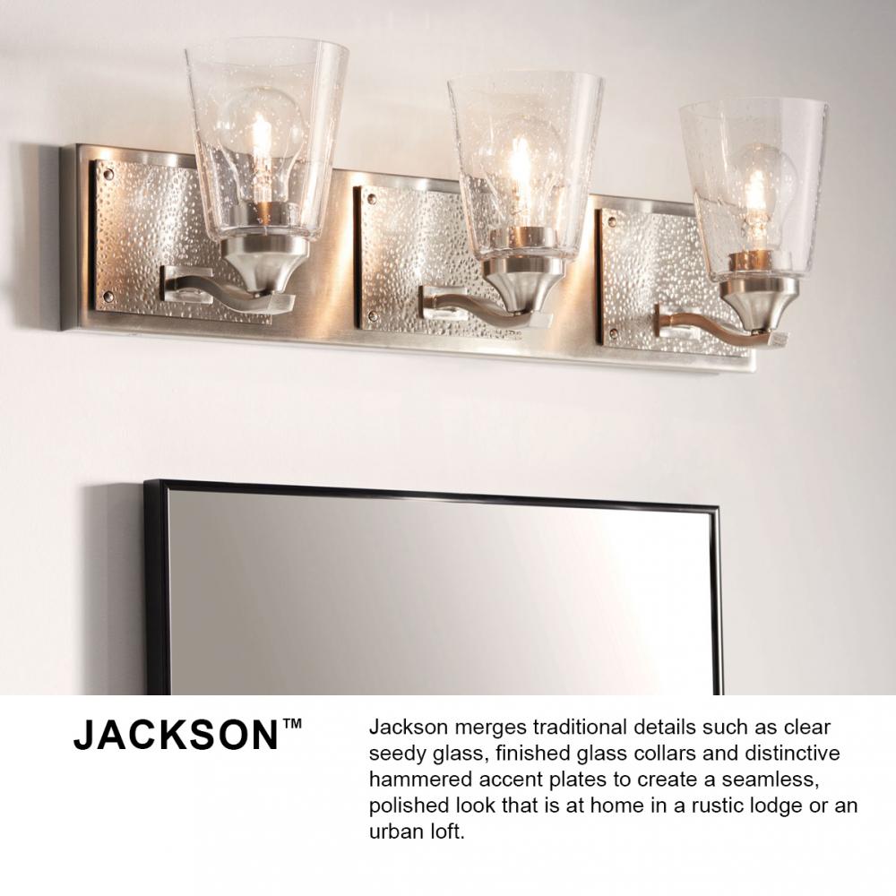 Jackson merges traditional details such as clear seedy glass, finished glass collars and distinctive hammered accent plates to create a seamless, polished look that is at home in a rustic lodge or an urban loft.